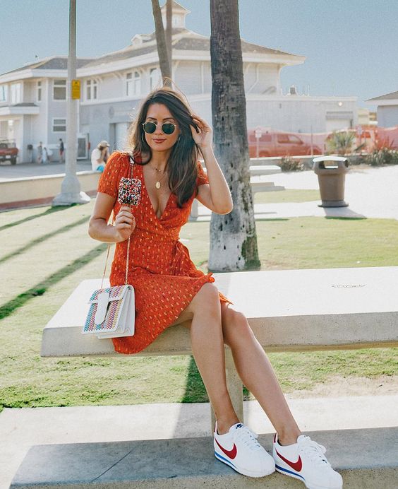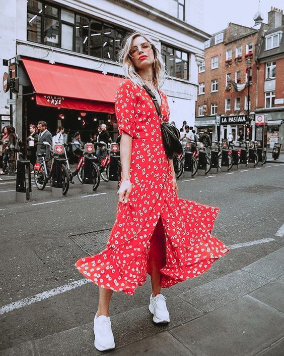 Last but not least, the romantic red dress with a fluttering hem and vibrant prints offers a cheerful contrast to the casual white sneakers. This outfit is bound to turn heads, whether you’re browsing the local farmers’ market or dancing away at an outdoor festival.