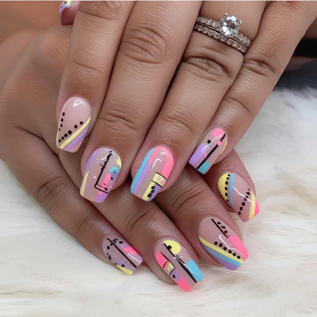 This one feels like a fresh smoothie in nail form—bright, juicy, and completely energizing. The sharp diagonal blocks of green, pink, yellow, and blue create bold lines that feel graphic yet clean. It’s a confident look that says you’re not afraid of color this spring.
