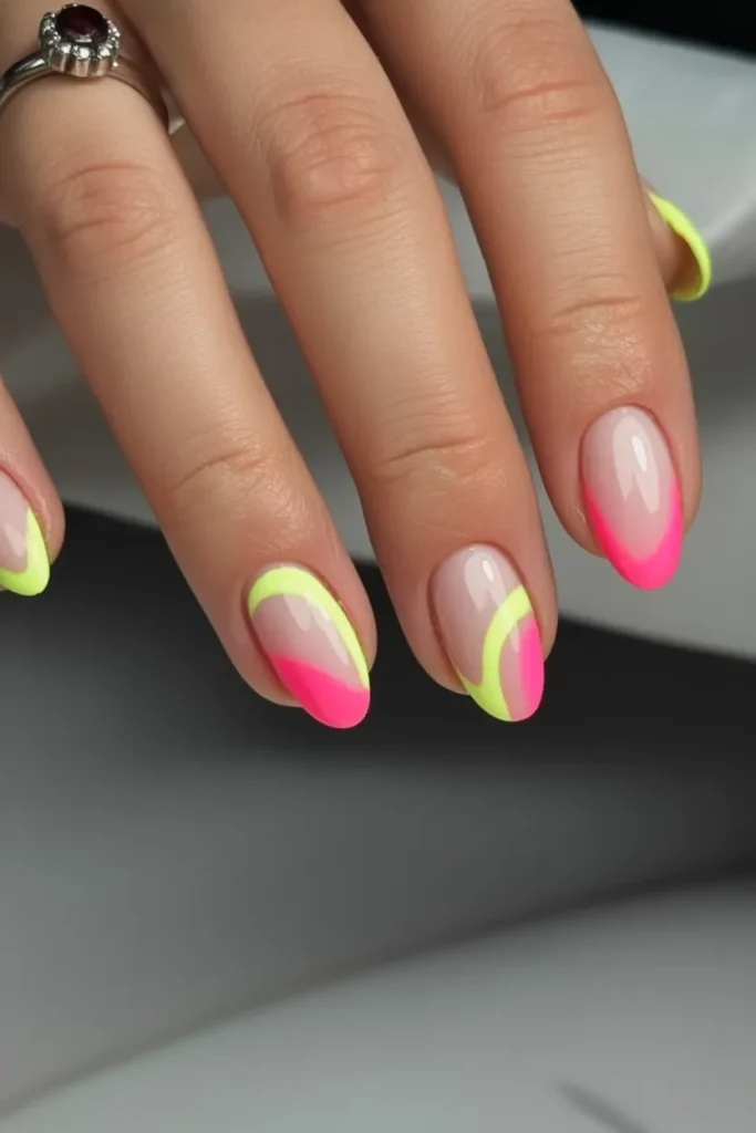 This is not your classic French—and that’s exactly why I love it. Neon pink paired with electric lime curves along the tips, creating bold, fluid lines that feel playful and youthful. The nude base keeps it grounded, but the color combo is pure 2026 energy.