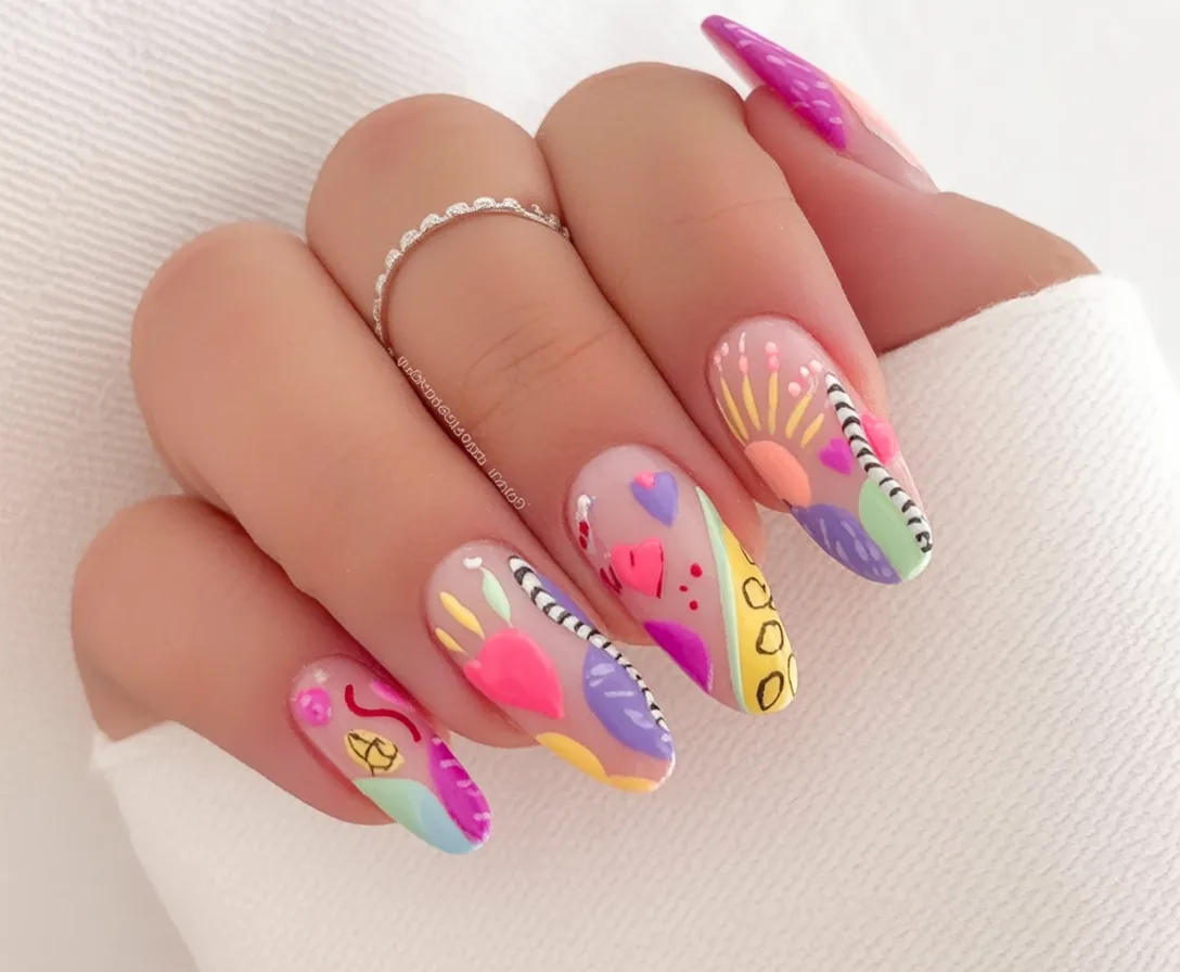 This set feels like a tiny gallery on your fingertips. Bright hearts, graphic shapes, little bursts of color—it’s pure. Art energy with a cheerful, almost nostalgic twist. The mix of pastels and bold pops gives that “I’m ready for sunshine” mood that defines spring abstract nails 2026. It’s fun without being childish and expressive without feeling chaotic—the kind of design that makes strangers grab your hand just to look closer.