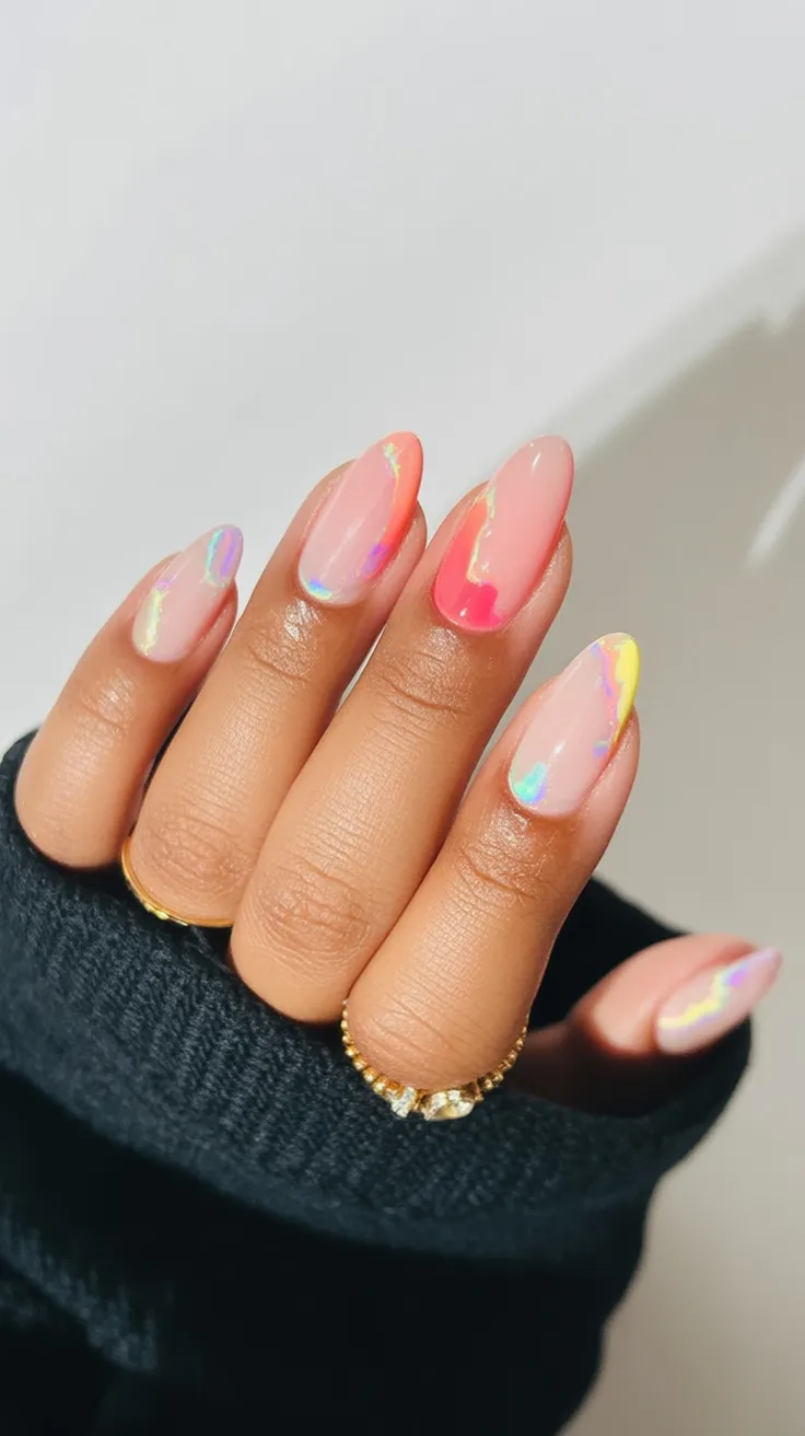 There’s something magical about this soft, glowing finish. The sheer pink base paired with subtle iridescent streaks in yellow, blue, and coral feels almost ethereal. It catches the light in the prettiest way, giving you that fresh, dewy look that just belongs to spring.
