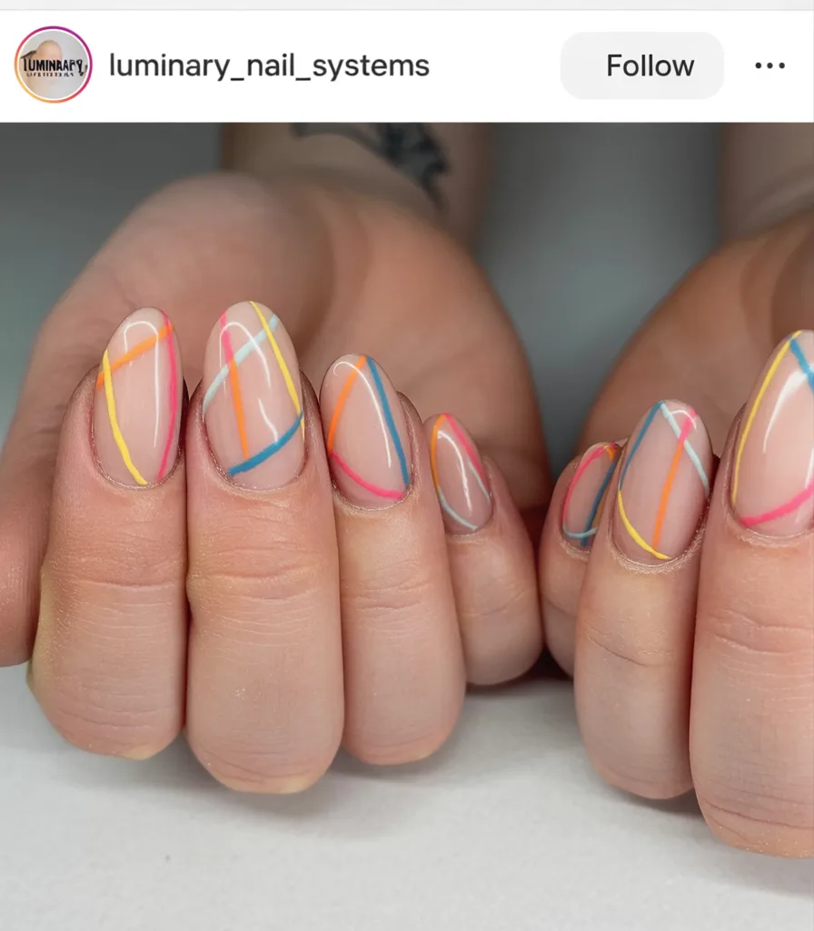 Soft nude with delicate, colorful lines—sometimes less truly is more. These airy curves feel modern, almost editorial, like something you’d spot in a chic beauty campaign. The negative space keeps it light and refined for spring.
