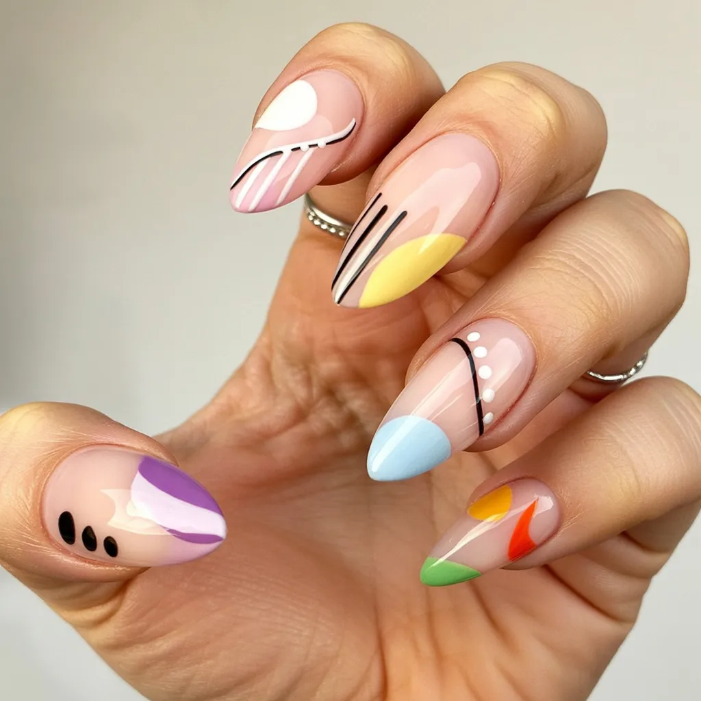 If you love variety, this set is like a curated collection of tiny masterpieces. Dots, stripes, curved panels, and bold color accents all come together in one cohesive look. It’s creative, expressive, and absolutely on trend for spring abstract nails 2026.