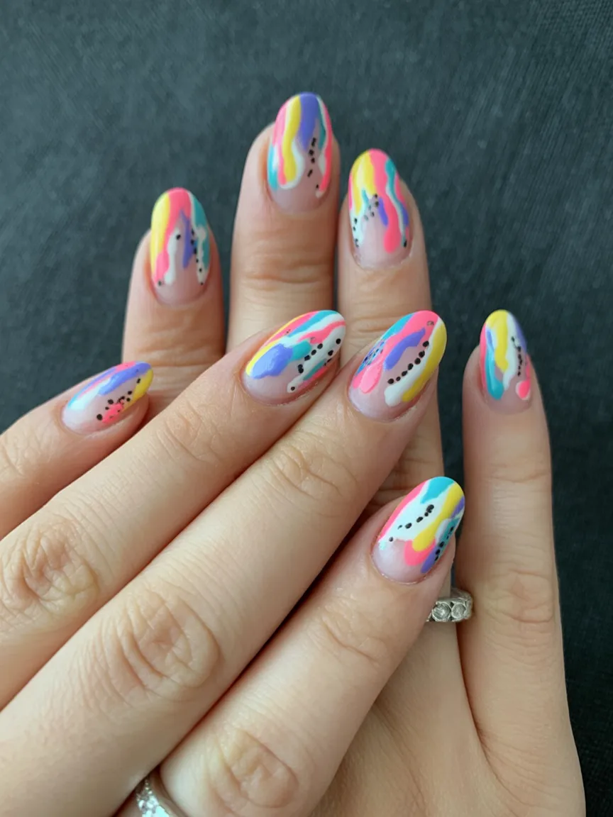 These colorful drips look like melted candy—in the most sophisticated way possible. Bright pink, teal, yellow, and lavender cascade over a sheer base, dotted with tiny black accents. It’s joyful, expressive Art that doesn’t take itself too seriously.