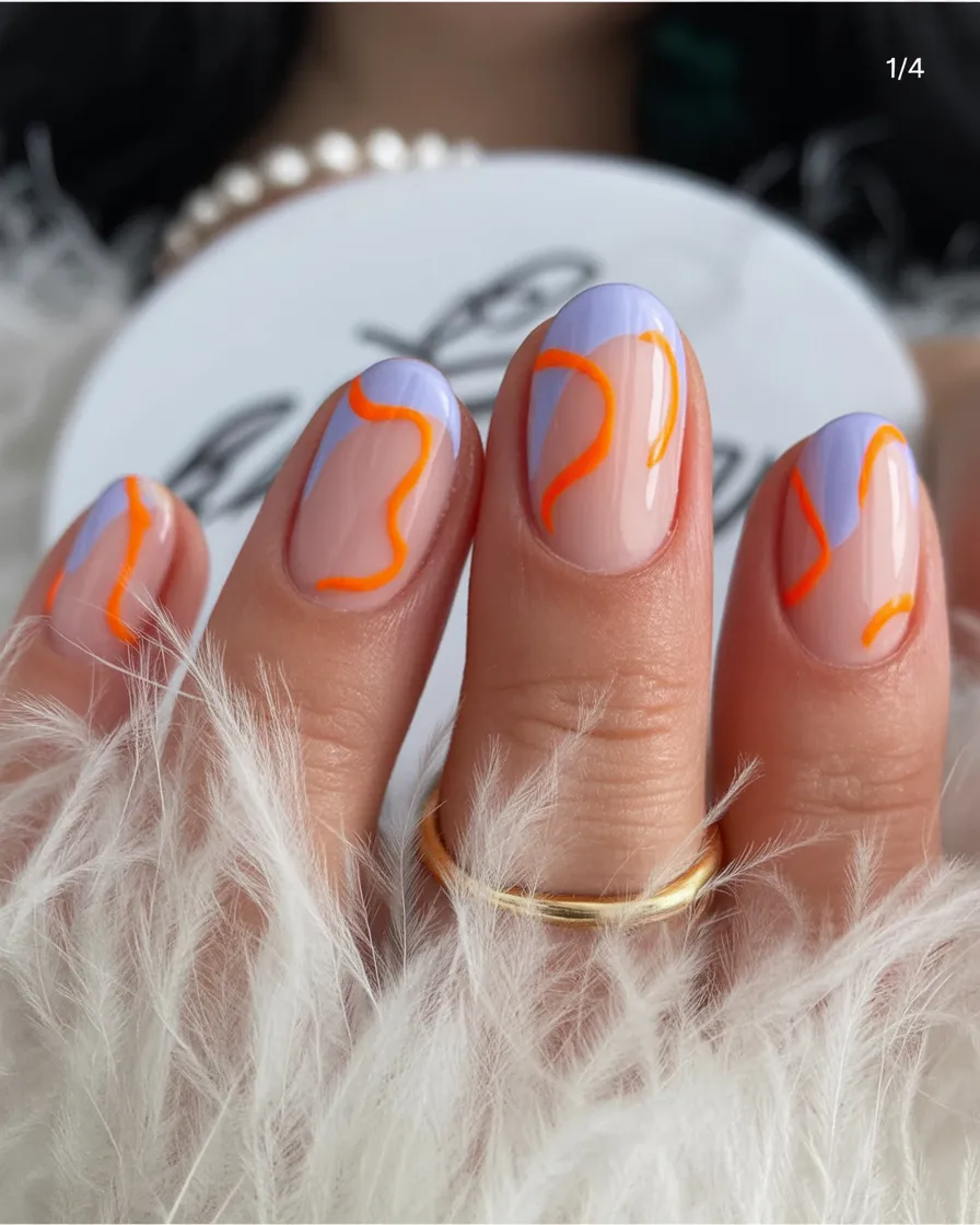 Okay, can we talk about how chic this is? A soft nude base with lavender tips and bold neon orange squiggles—it’s minimal, yet it absolutely pops. The contrast between the calm pastel and the electric lines feels modern and confident, like you know exactly who you are in 2026.
