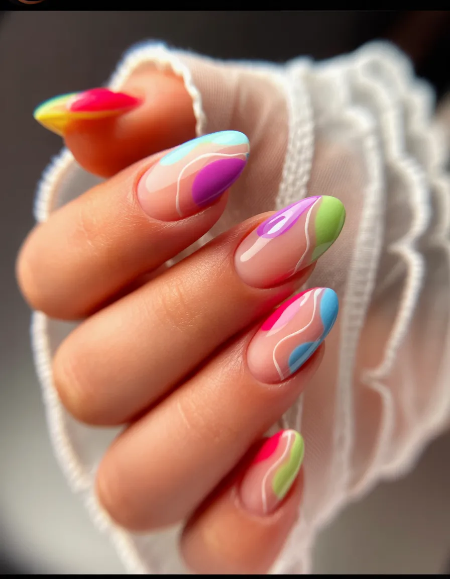 These look like someone flicked a paintbrush across a nude canvas—in the best possible way. Bold strokes of yellow, violet, and blue feel spontaneous and artistic, yet the clean almond shape keeps everything sophisticated. It’s modern Art meeting grown-up glam, and I am absolutely here for it.