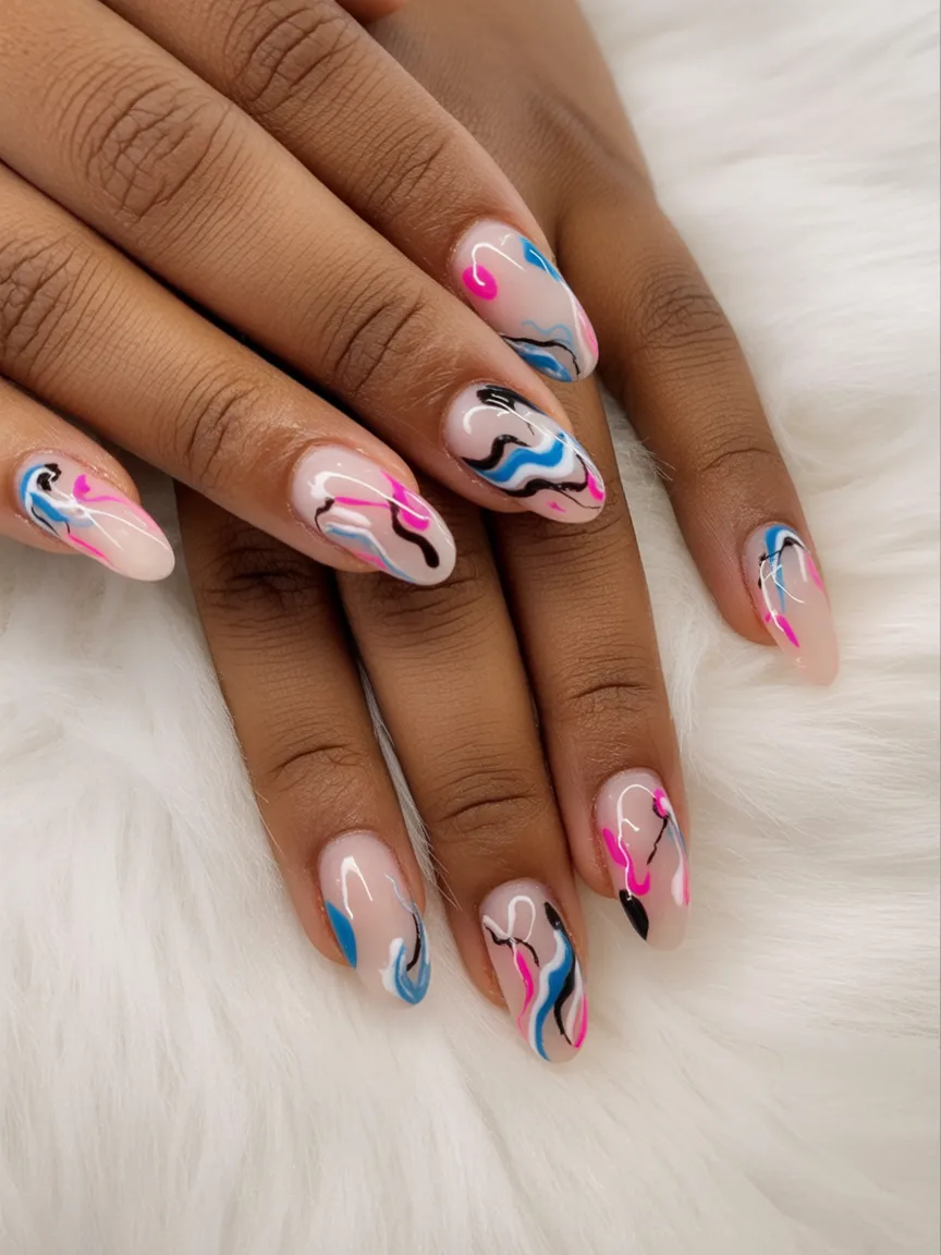 You know that feeling when winter finally breaks and everything starts flowing again? That’s exactly what these soft nude nails with sweeping blue, pink, and black lines capture. The movement feels effortless, almost like watercolor in motion. It’s subtle but undeniably trendy, giving you that polished, grown-woman vibe while still embracing playful Art.