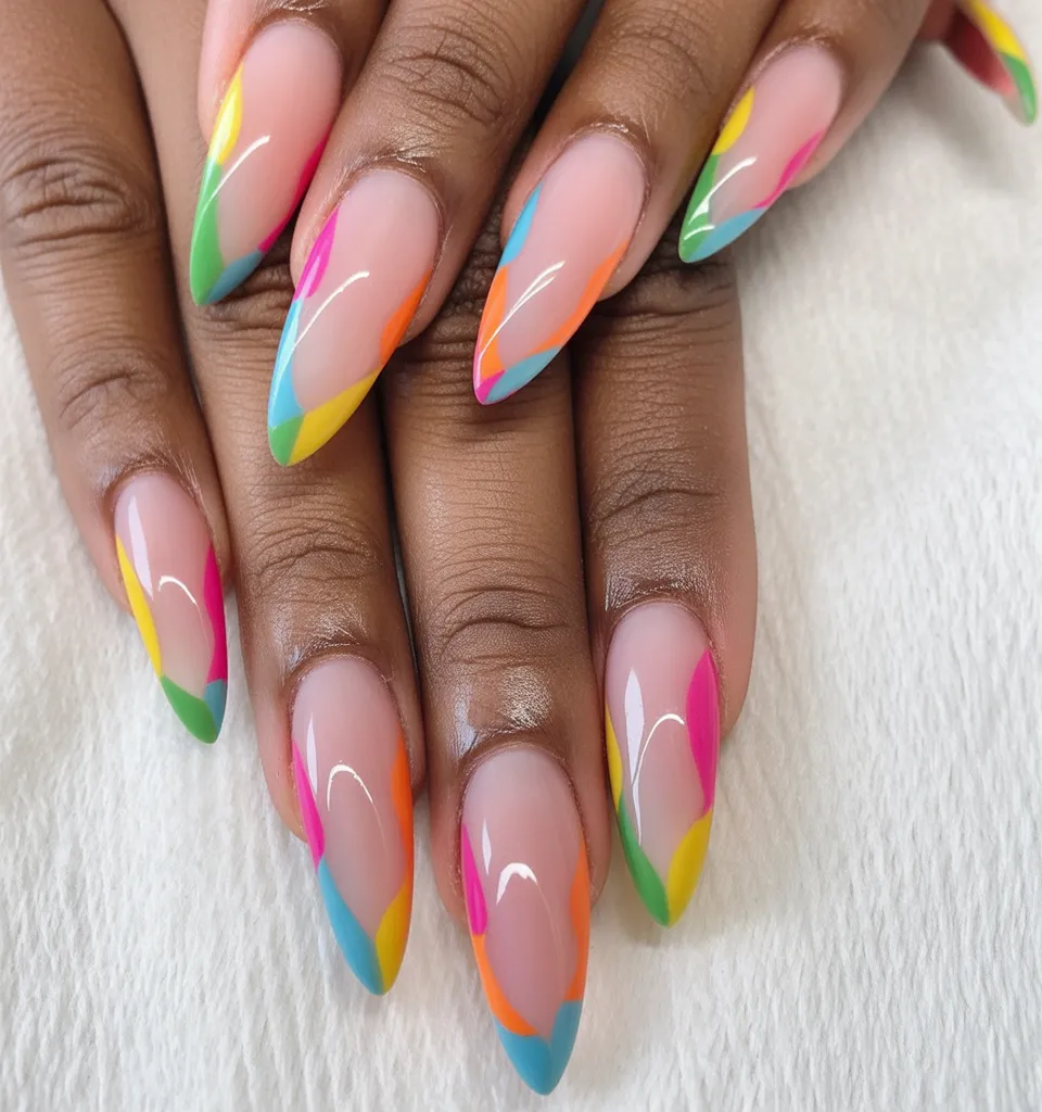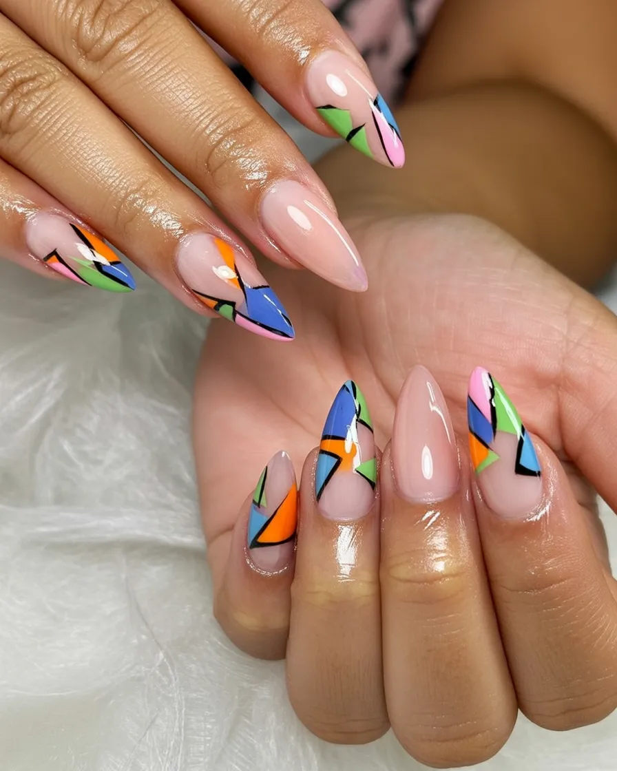 These bold geometric panels in green, blue, pink, and orange feel sharp, confident, and unapologetically modern. The almond shape keeps the strong lines elegant, while the negative space prevents the look from feeling heavy. It’s abstract with attitude.