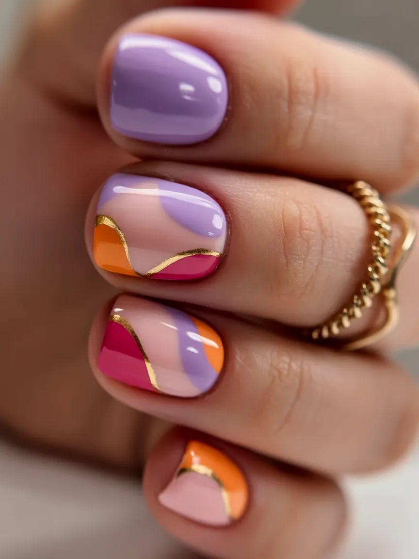 This one feels like spring wrapped in silk. Soft lavender, blush pink, and juicy orange melt together in curved color panels, separated by the thinnest kiss of gold. It’s refined but still playful—like you’ve mastered the art of balance. The glossy finish gives it that polished 2026 glow, while the flowing lines keep it firmly in the abstract camp.