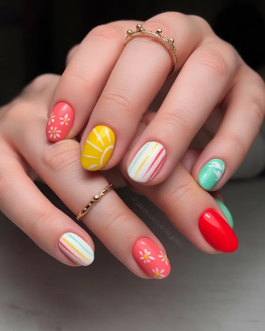 How can you not smile at these? Little daisies, sunshine rays, stripes—it’s like spring decided to throw a party on your nails. The combination of red, yellow, mint, and soft white feels joyful and carefree but still thoughtfully designed.
