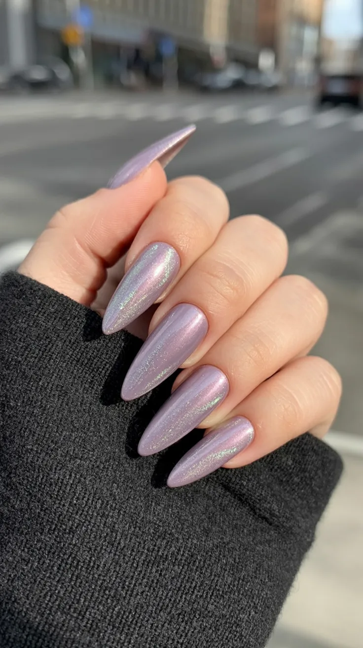 There’s a cool, city-girl confidence in this look. The lilac cat-eye shimmer catches the light in a way that feels modern and slightly edgy but still soft enough for spring. It’s the kind of manicure that feels just as right walking through downtown as it does at brunch with friends.