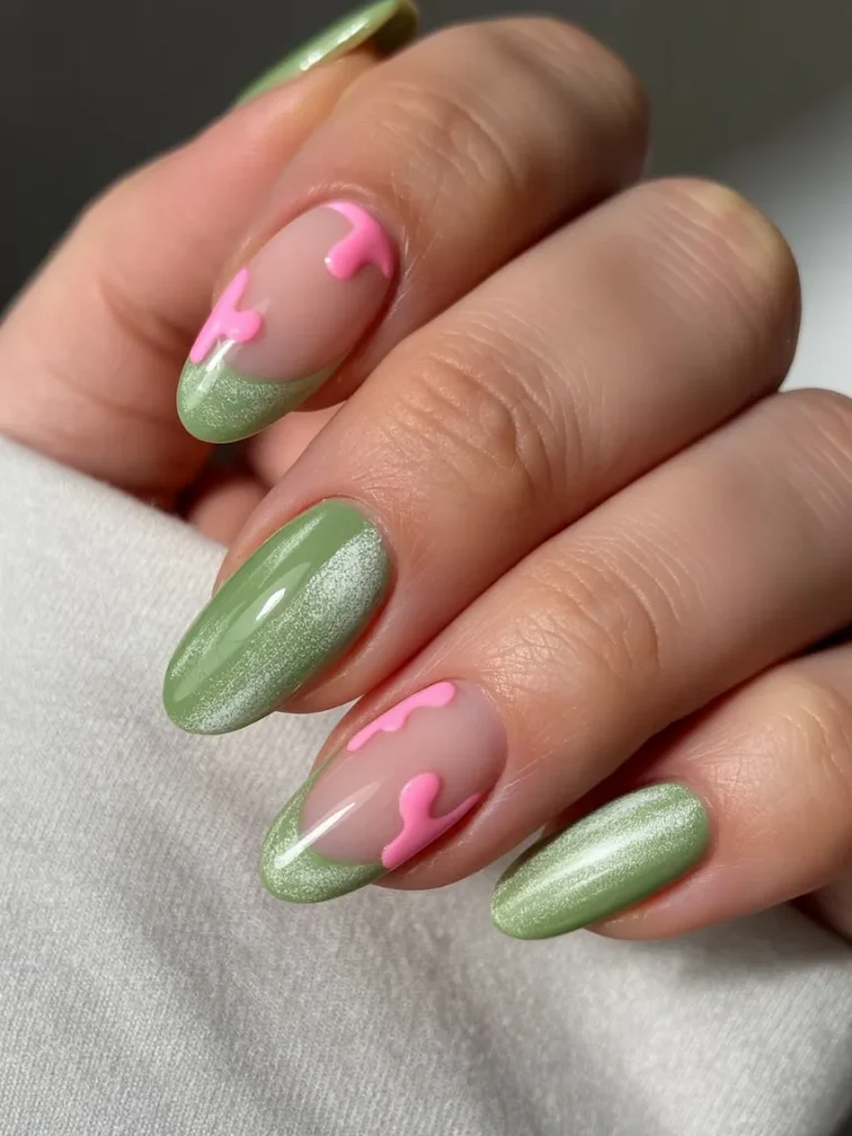 There’s something quietly joyful about this look—like the first warm day of spring when you leave the house without a jacket and feel instantly lighter. The green cat-eye base feels fresh and grounded, while those playful pink drips add a little wink of personality. It’s not loud, but it’s definitely not boring either. This is the kind of manicure that makes you notice your hands more, in a good way, especially when sunlight hits that soft magnetic shimmer just right.