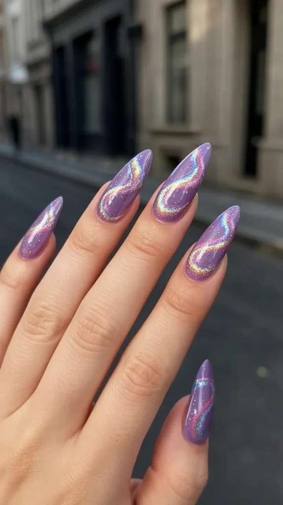 This look is pure main-character energy. The purple base paired with flowing, almost celestial cat-eye waves feels bold yet elegant, like you know exactly who you are and you’re not afraid to show it. It’s dramatic without being heavy, and that shifting shimmer gives the nails real depth—the kind people can’t help but stare at twice.