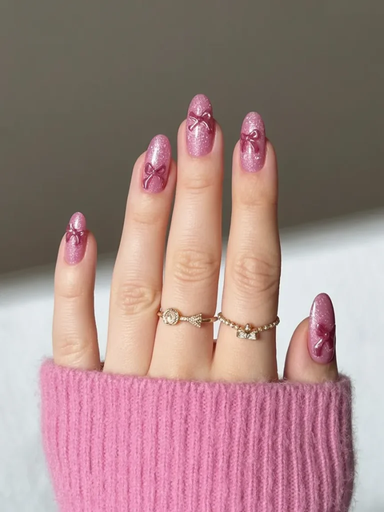 Soft sparkle, gentle shine, and tiny bow details—this manicure feels like a little celebration on your fingertips. The pink cat-eye base glows delicately, while the raised bow accents add texture and charm without overpowering the look. It’s sweet but still refined.