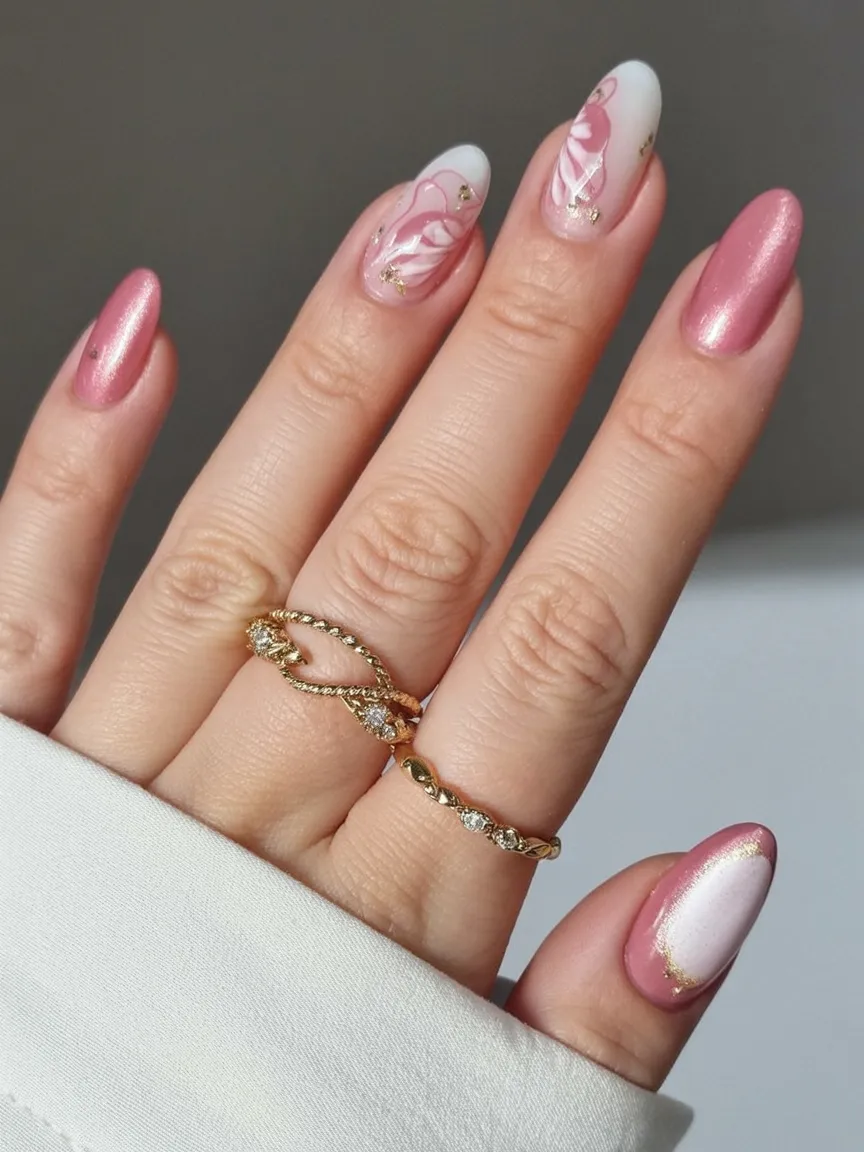 This manicure feels romantic without being overly sweet. The soft pink cat-eye base creates a gentle glow, while the floral art details add a touch of spring nostalgia. It’s graceful, feminine, and quietly charming.