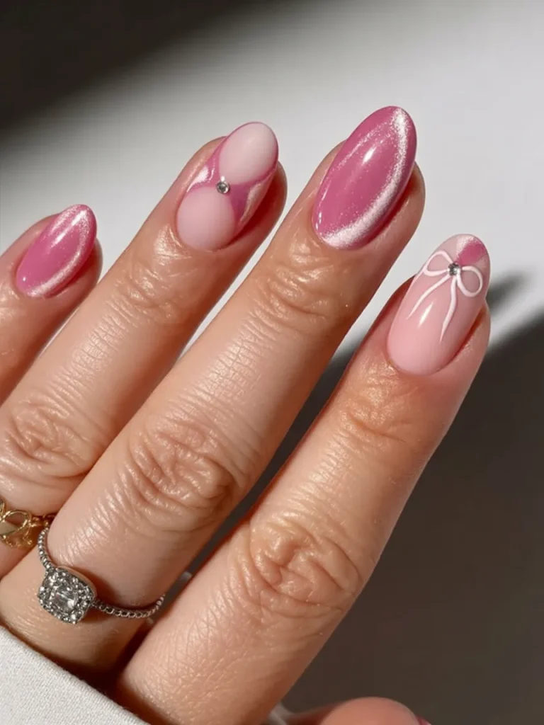 2. Pink Cat Eye Nails with Delicate Bow Details