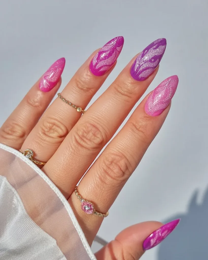 This set is playful confidence in nail form. The blend of pink and purple tones with that flame-like cat-eye pattern feels energetic, flirty, and unapologetically fun. It’s the kind of manicure that instantly boosts your mood—bold enough to feel exciting but still soft enough to stay wearable.