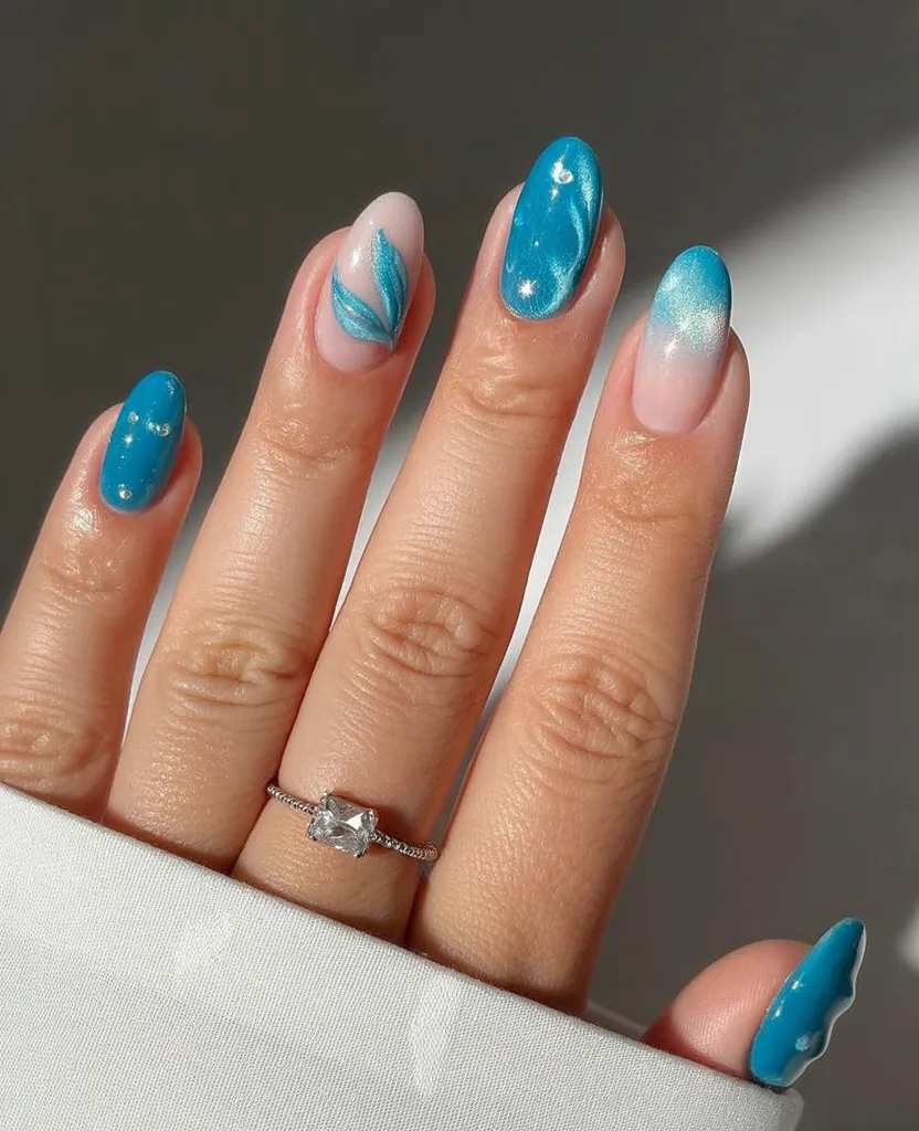 This is an ideal option if you lean toward simple, low-maintenance designs. It works beautifully on short to medium almond shapes and grows out gracefully. Blue remains a key color trend, and this easy version fits seamlessly into everyday life while still feeling modern.