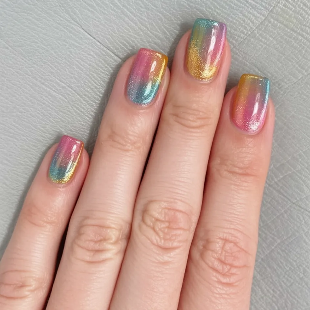 This look is pure joy. The rainbow cat eye effect blends pink, blue, and gold tones into a playful yet polished finish that instantly lifts your mood. On a square shape, it feels modern and graphic, with just enough sparkle to keep things interesting.