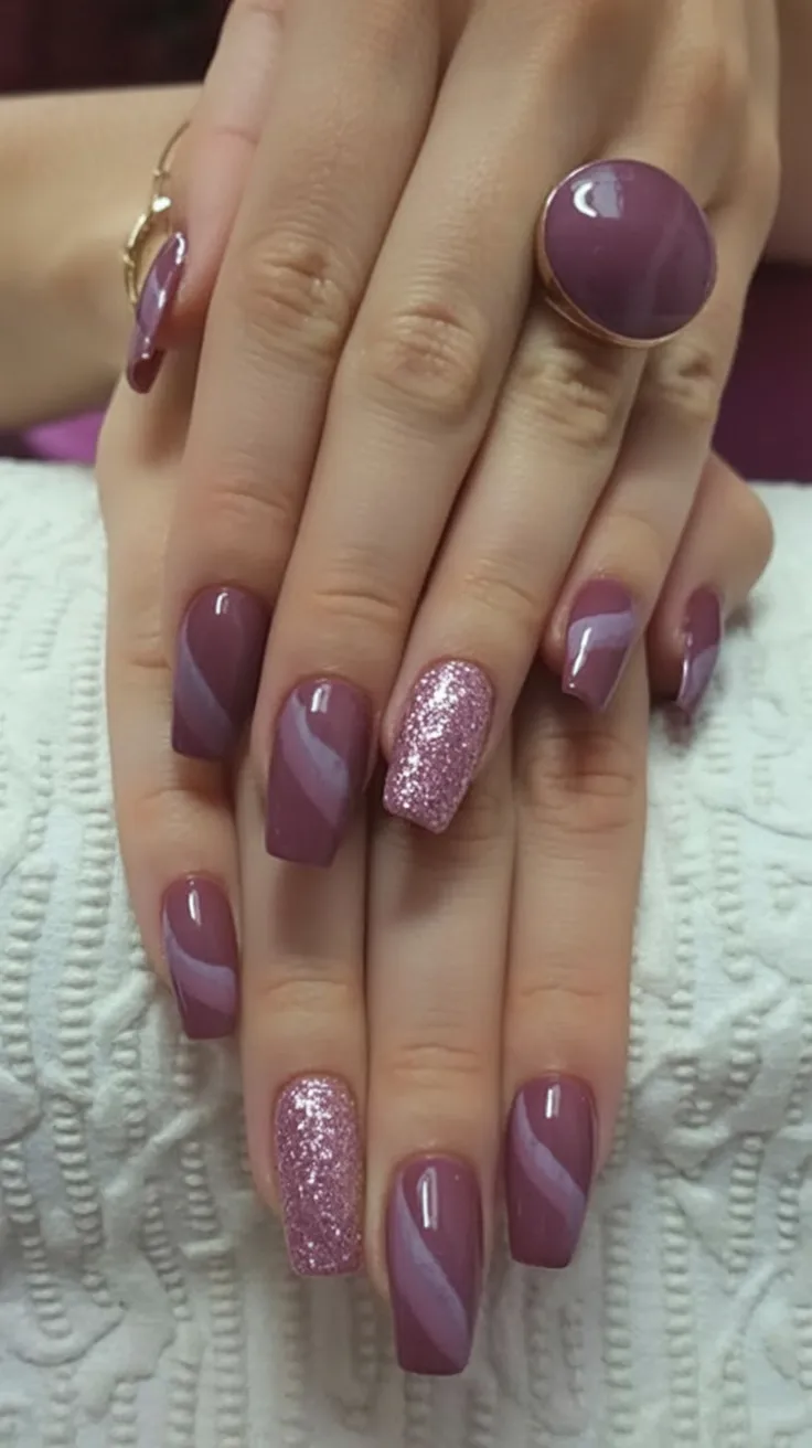 This set feels cozy, confident, and quietly glamorous. The mauve cat-eye base is rich and flattering, while the glitter accent nail adds just enough sparkle to feel special. It’s not flashy—it’s intentional, like you planned this look just for you.