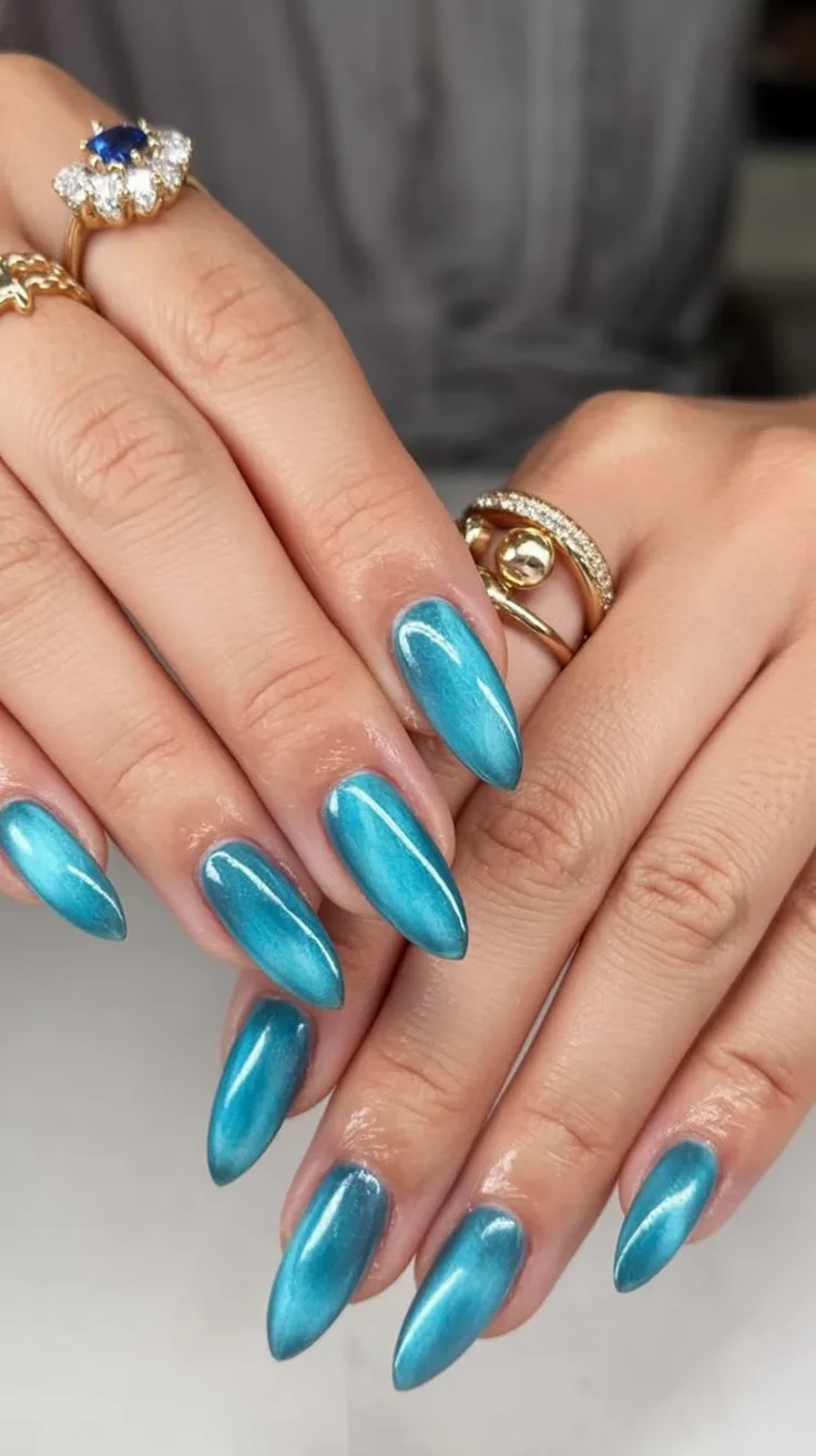 This style is ideal if you love clean lines and contemporary designs. Blue works beautifully across skin tones, and the cat-eye effect adds dimension without extra embellishment. Pair it with minimal jewelry and let the art speak for itself—it’s striking but surprisingly easy to live with.