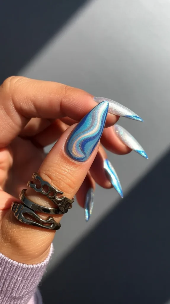 Cool, modern, and a little hypnotic—this blue cat-eye manicure feels like spring skies meeting polished chrome. The silvery wave through the center gives it that magnetic pull, while the sharp almond shape keeps everything sleek and intentional. It’s a look that feels powerful but still fresh, perfect for when you want your nails to say something without saying too much.