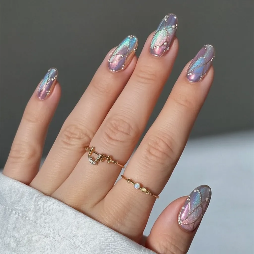 This manicure feels almost magical. The iridescent cat-eye base shifts Colors with every movement, while the tiny jewel accents add a soft sparkle that feels intentional, not overdone. It’s delicate, luminous, and quietly captivating.