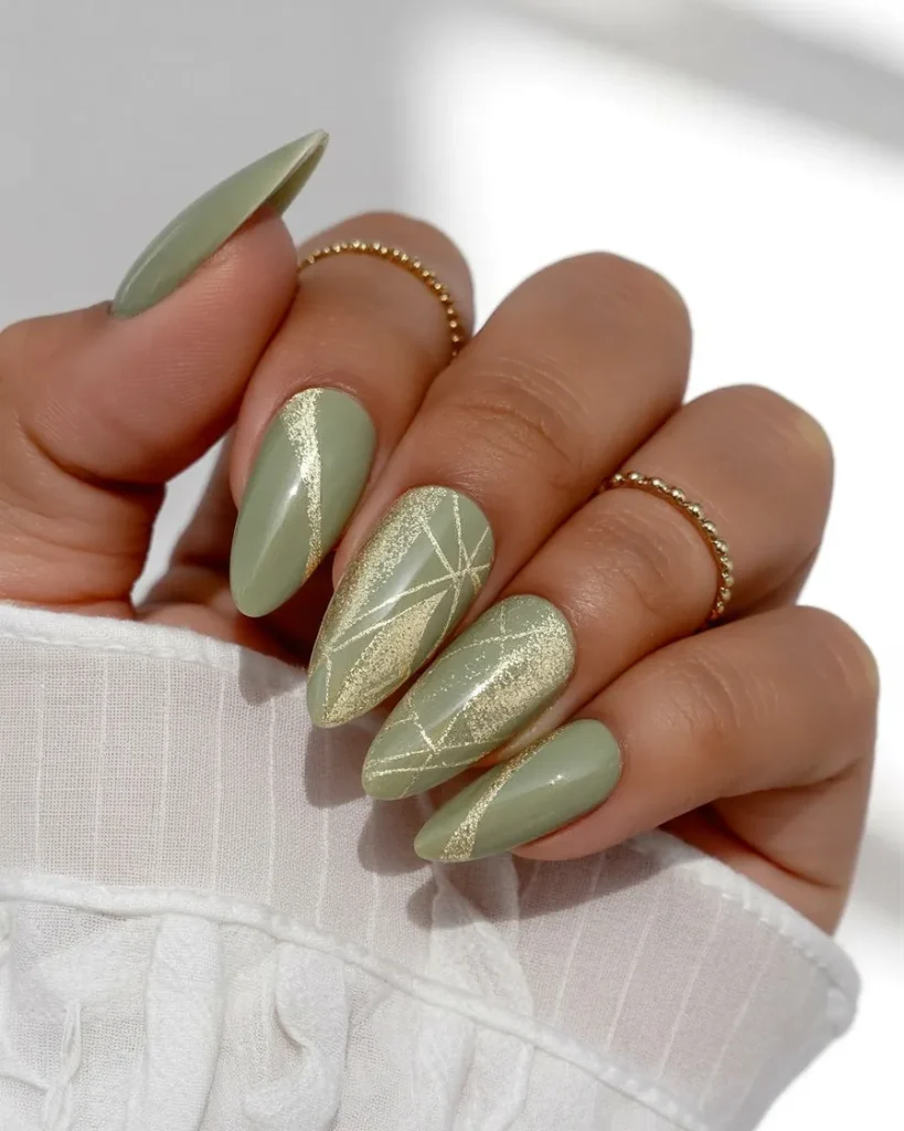 This look is understated luxury at its best. The muted green cat-eye base feels calm and sophisticated, while the fine gold lines add just enough detail to elevate it. It’s modern, grounded, and incredibly chic—the kind of manicure that quietly signals great taste.