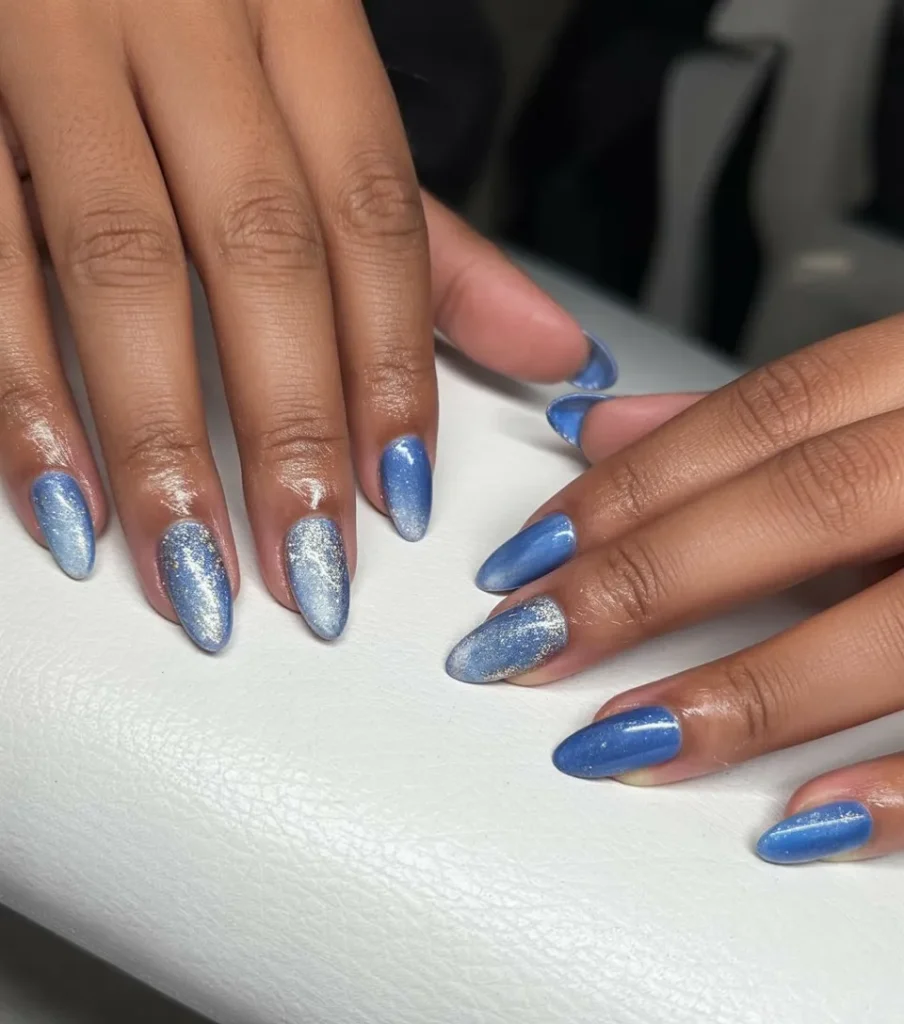 7. Blue Cat Eye Nails with Soft Sparkle Finish