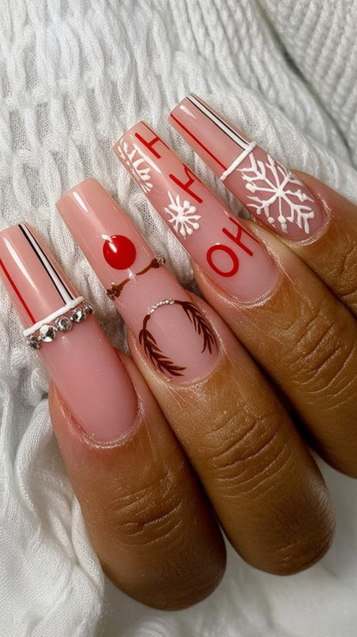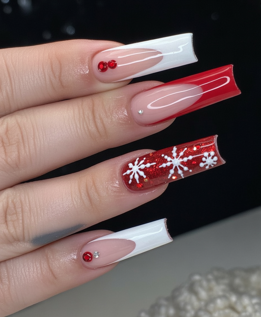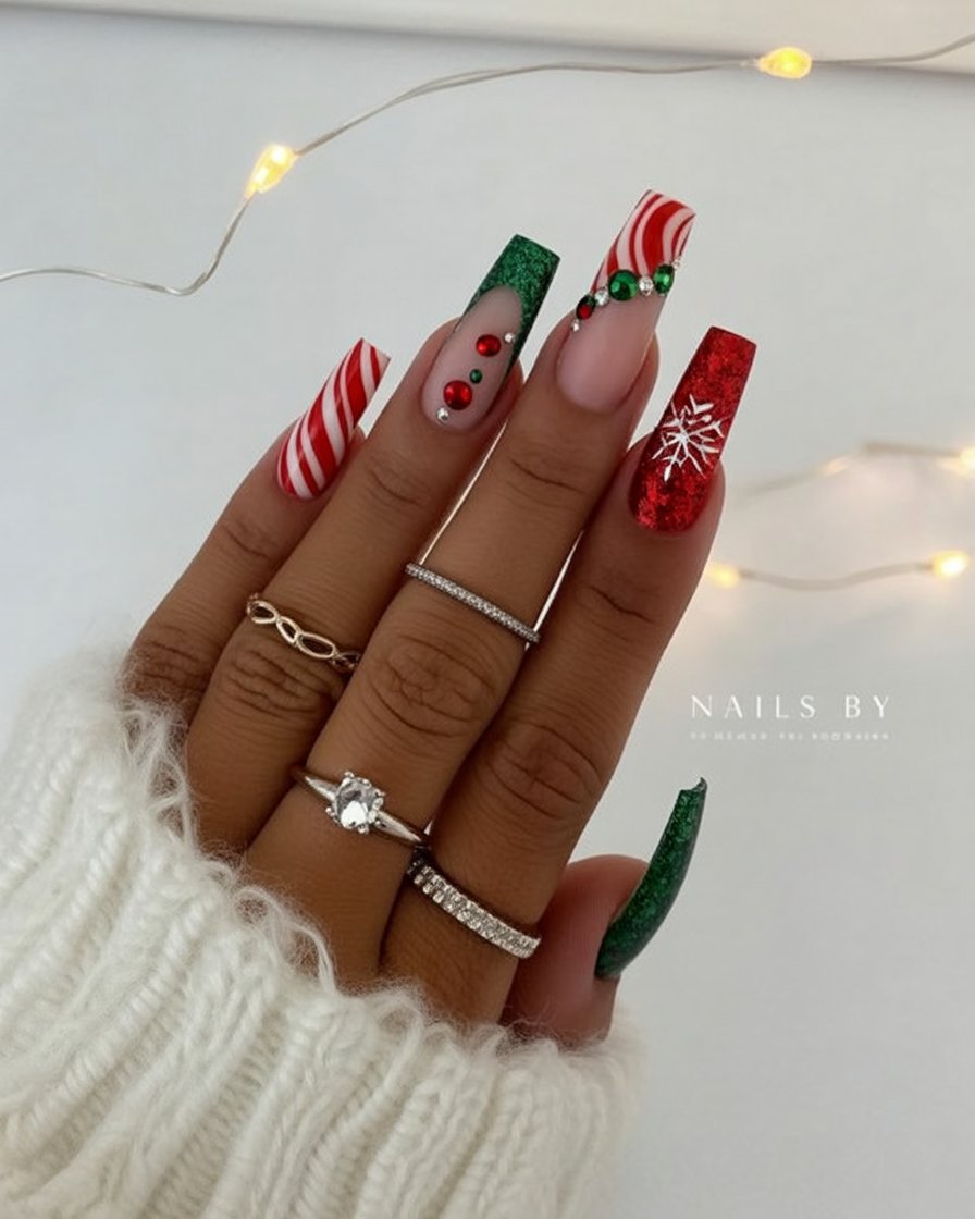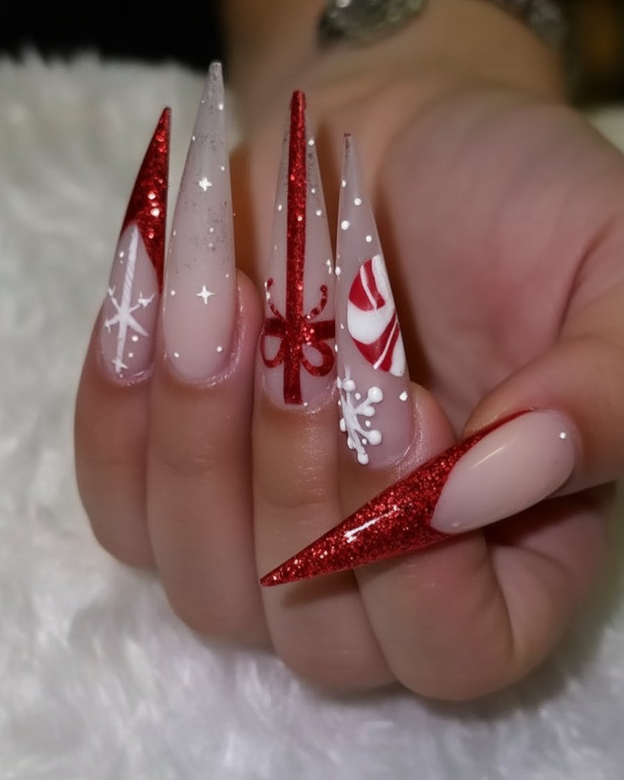 Best for long stiletto acrylics, this design is ideal if you love nails that command attention. The sparkle ensures they’ll catch the light wherever you go, and the bold red shade ties everything back to classic holiday vibes. Perfect for women who want their manicure to double as a statement accessory.
