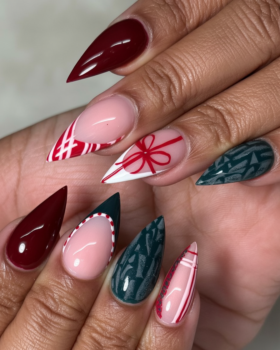 These nails look like tiny wrapped presents, complete with glittery bows and festive patterns. With pink, white, and burgundy tones, plus a sparkling gem wreath, they capture the playful joy of unwrapping gifts under the tree. They’re sweet, whimsical, and full of holiday cheer.