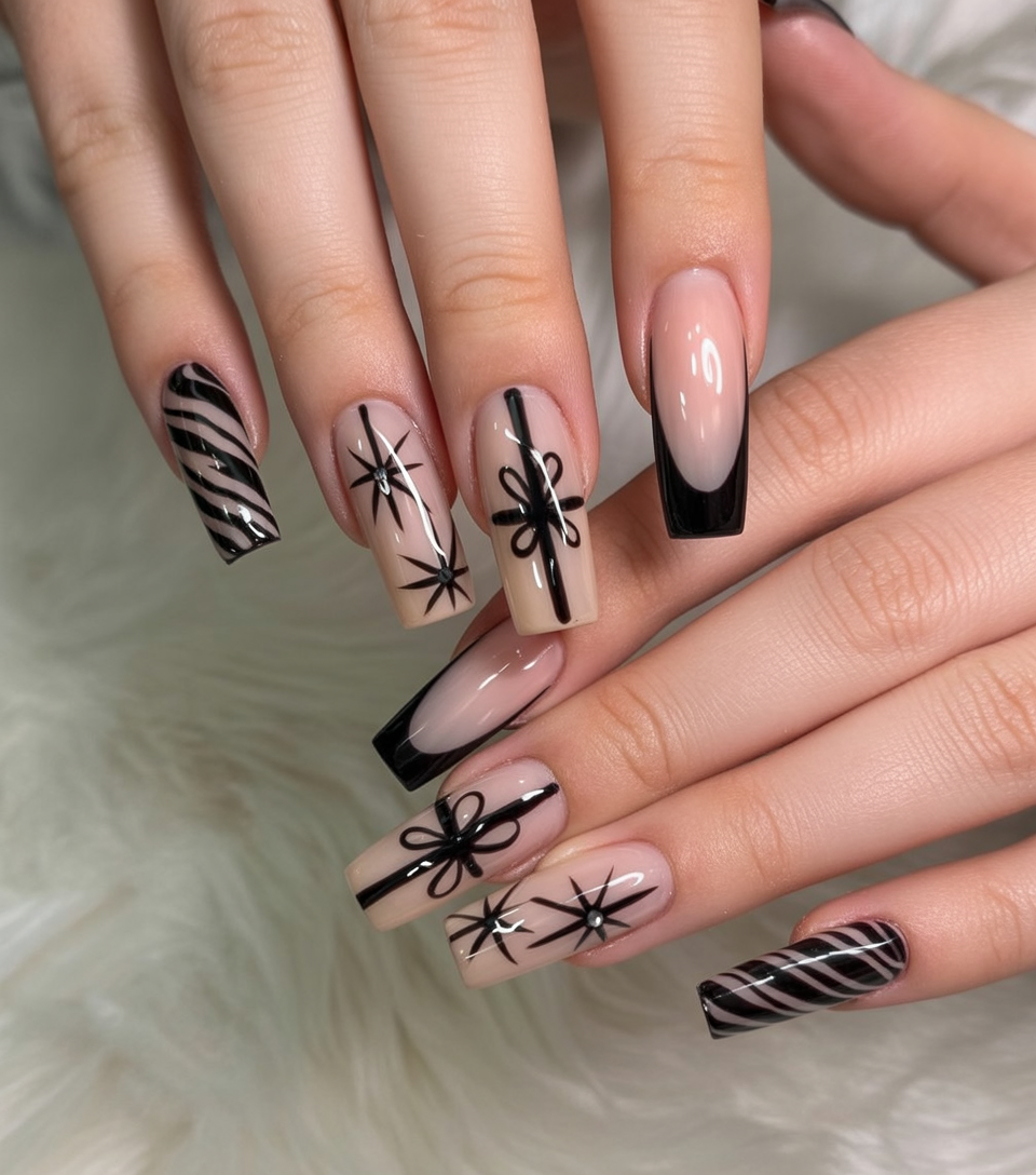 Nude polished black square tips say glitz and glam for Christmas without the intimidation of too much glitter. Sleek bows, stars, and stripes feel like chic gift wrapping at the fingertips and make this design classy and bold. A design that screams “sophisticated baddie” is perfect for whoever likes their holiday inspiration with a little edge.