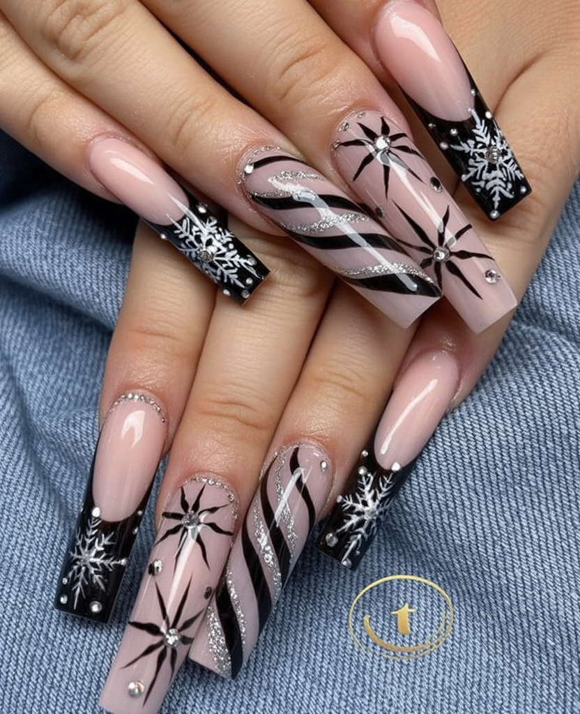 11. Black and Silver Snowflake Nails
