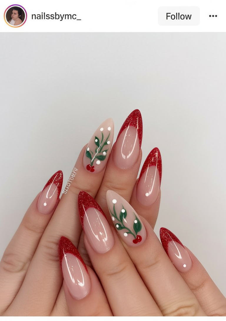 Romantic and bold, these nails use sparkling red tips and delicate mistletoe art to create a flirty holiday vibe. They’re glamorous without being fussy, and they make you feel instantly ready for holiday kisses under the mistletoe.