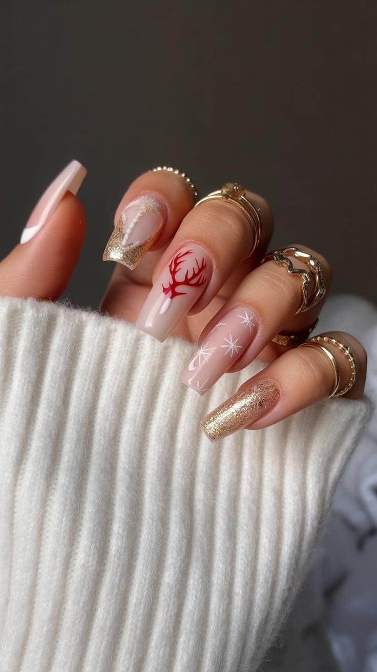 This look would suit beautifully medium-length square or coffin shapes. The gold glittery tips add sparkle to them, while a reindeer detail creates the fun seasonal vibe. Being versatile for casual afternoons and dressy evenings, they will glide you through the season effortlessly.