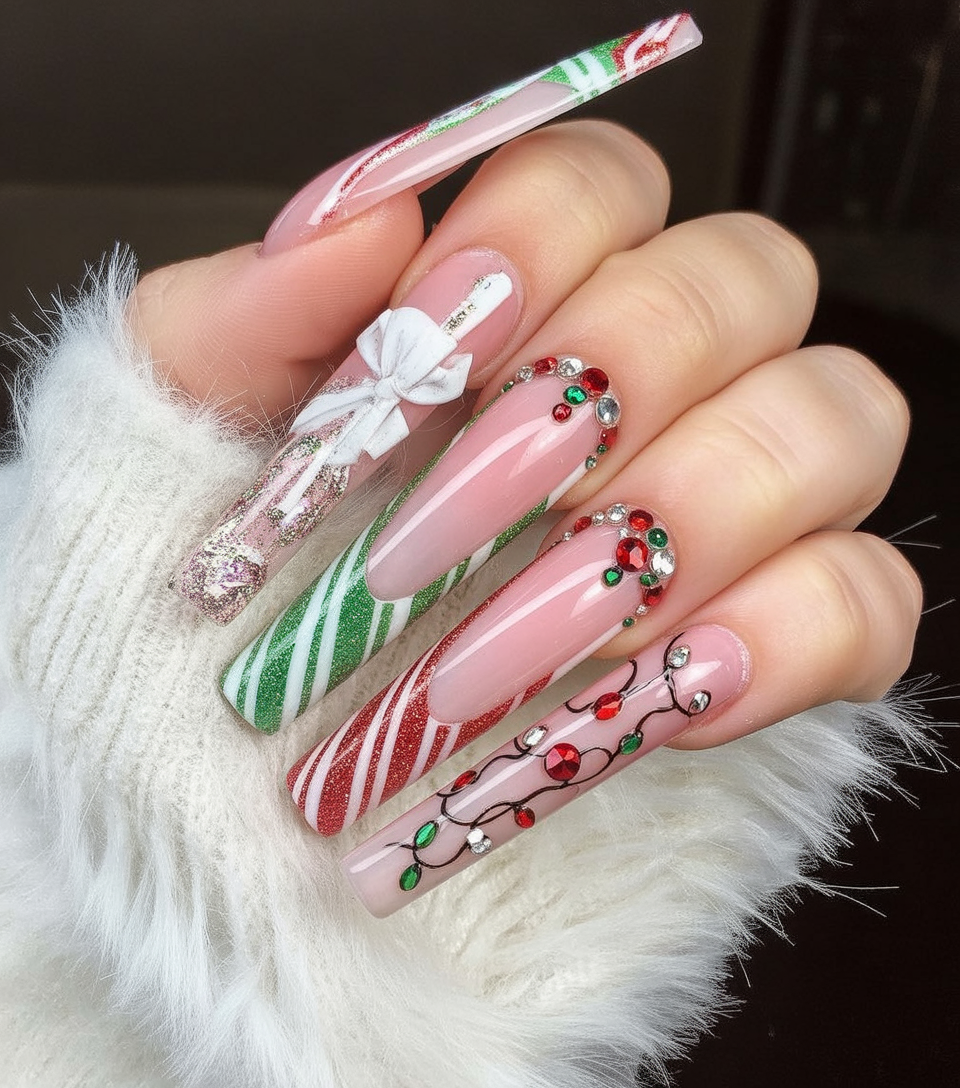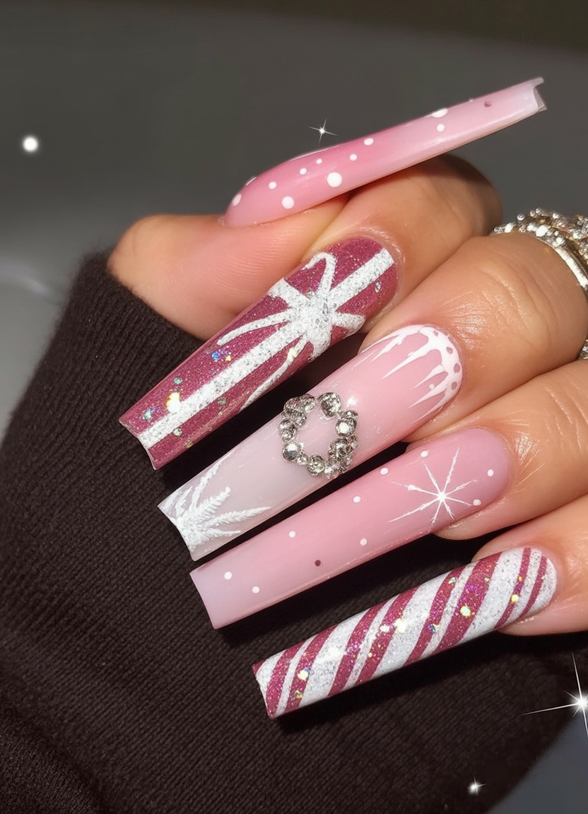 Best for long stiletto nails, this look works especially well if you love bold colors and sparkle. The gems add texture and light-catching shine, while the candy stripes keep it fun. They’re perfect inspo if you want a manicure that feels both Cute and festive.