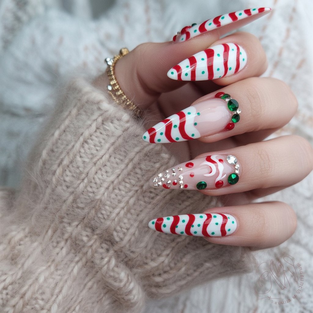 These nails are pure sugar rush. Red and white swirls, green dots, and jewel accents make them look like holiday candy come to life. They’re vibrant, playful, and full of energy — a perfect match for holiday fun.