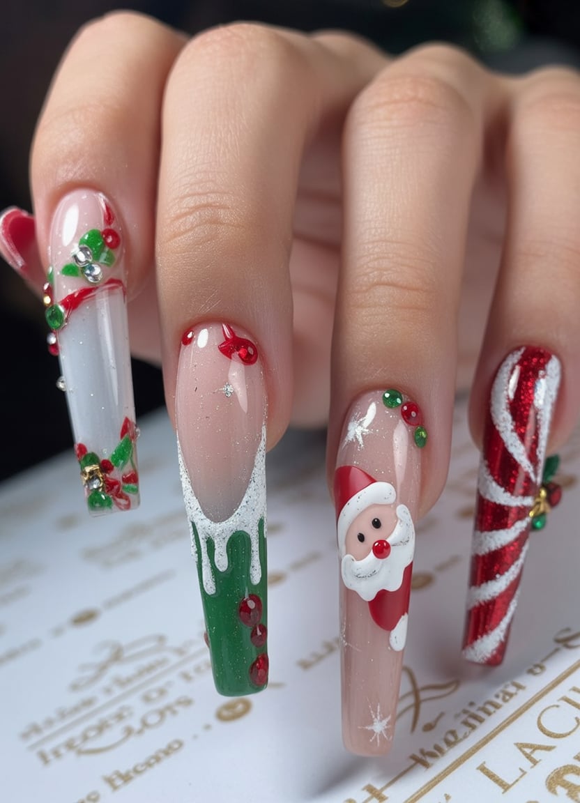Very long acrylic nails definitely provide a great canvas for this very intricate design. The gems and glitter perfectly catch the light, while the Santa and holly art set a very cheerful vibe for any occasion. These nails are brimming with fun vibes of the holidays, so they are perfect for Christmas parties and seasonal selfies.