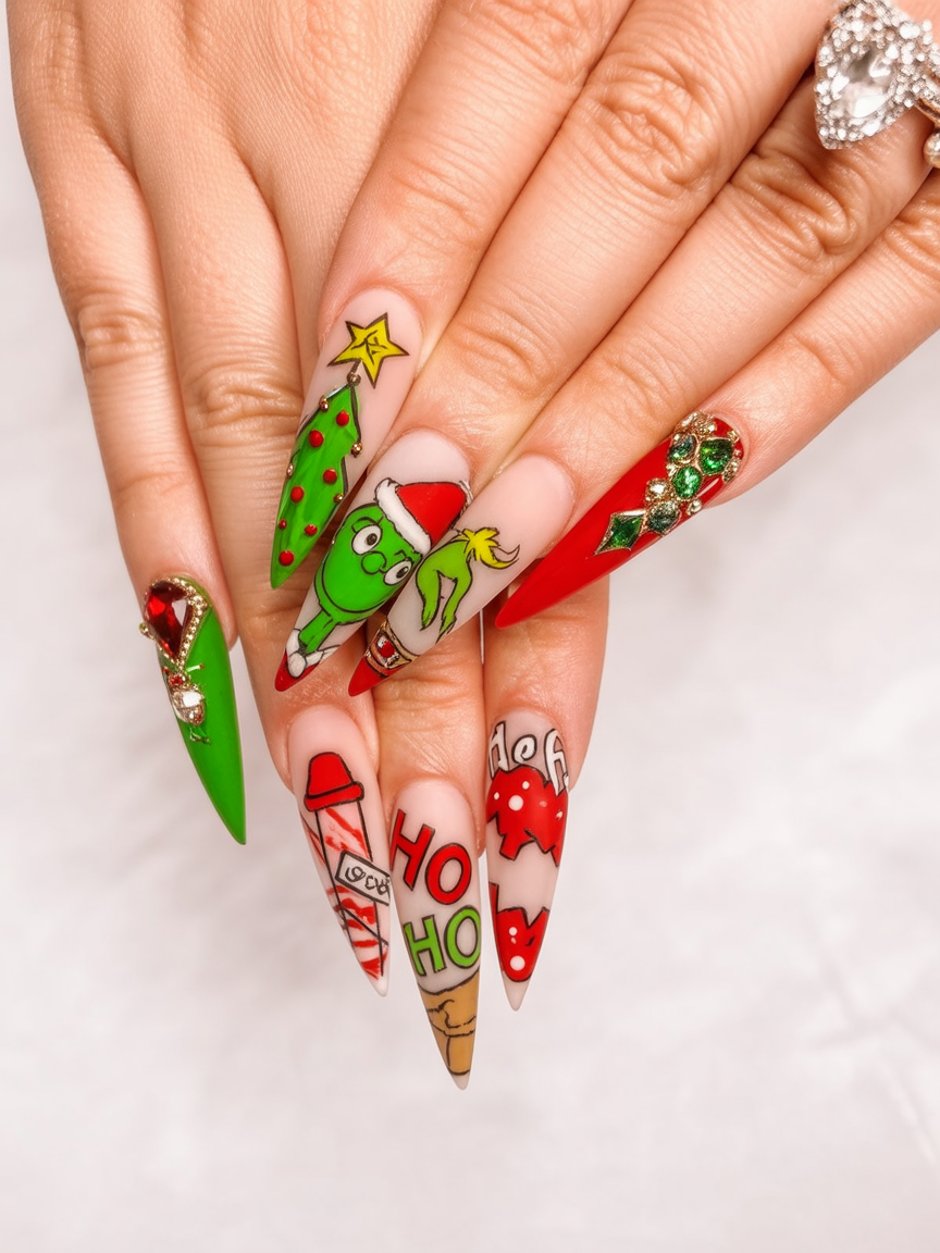 If you want your holiday nails to be as bold as your personality, these stiletto beauties deliver maximum drama. Bright green and red tones mix with cheeky Grinch art, a Christmas tree, and candy cane motifs for nails that practically shout holiday spirit. They’re playful, edgy, and instantly put you in the mood for festive fun — the perfect mix of cute chaos and baddie energy.