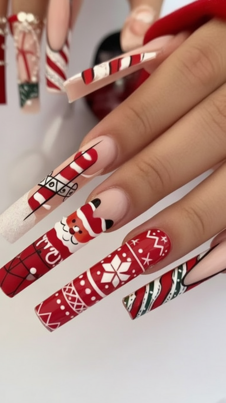 These long red nails are everything baddie Christmas inspo should be — bold, playful, and unapologetically festive. Santa face, candy-cane stripes, and cozy sweater vest-y patterns make each nail somewhat different yet keep them cohesive. They are the kind of nails that bring joy the moment you see them—like watching someone unwrap a gift you were sure you would love.