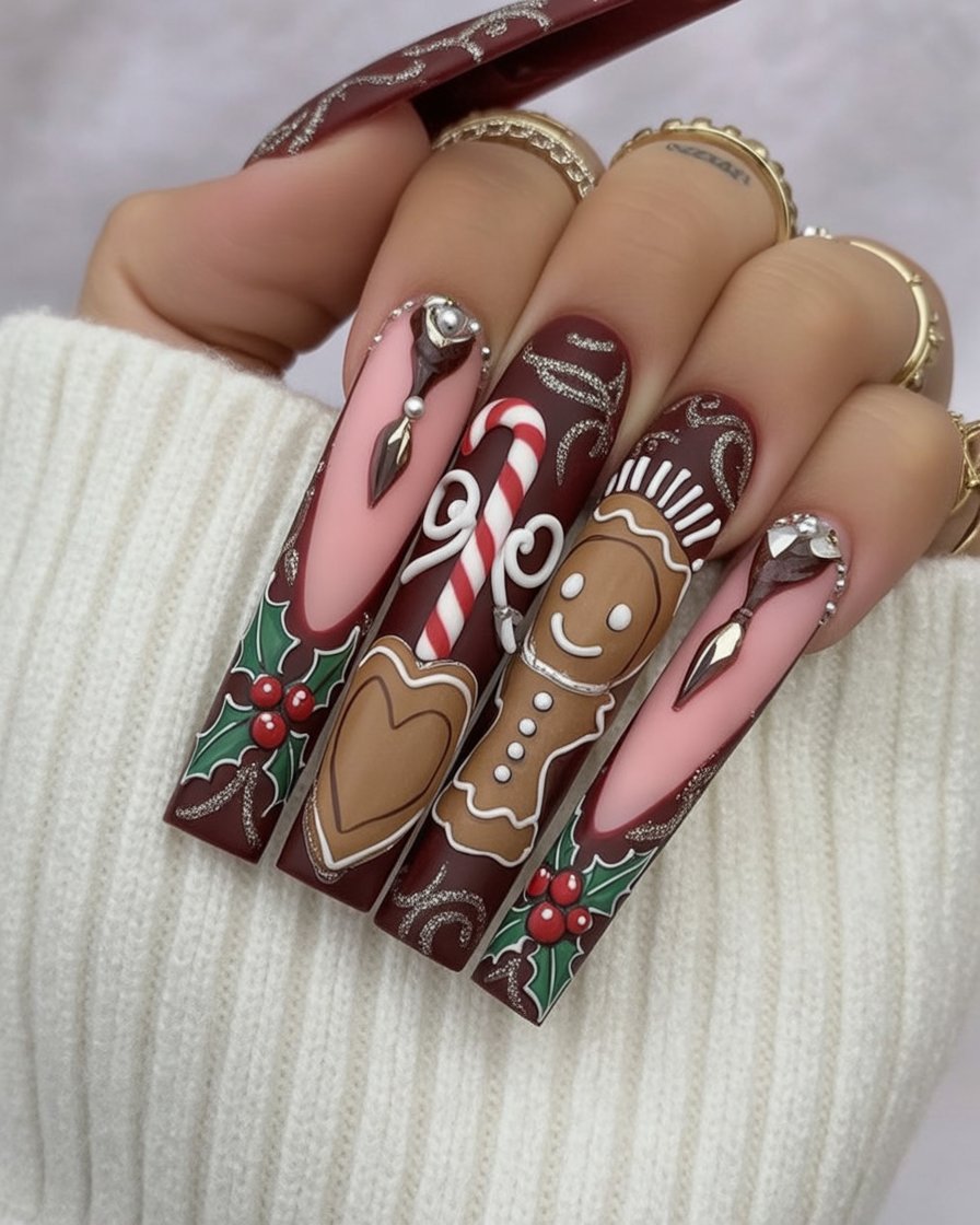 These nails are a whole holiday fairytale. With gingerbread men, holly leaves, candy canes, and cookie hearts, they turn your fingertips into a Christmas dessert table. It’s a playful, nostalgic design that makes you feel like you’re in the middle of a holiday movie.