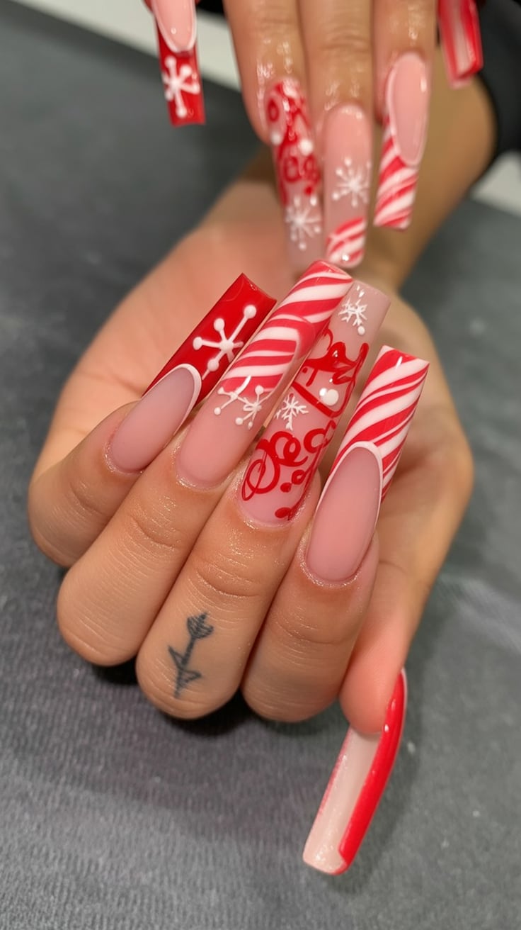9. Peppermint Red Holiday Nails