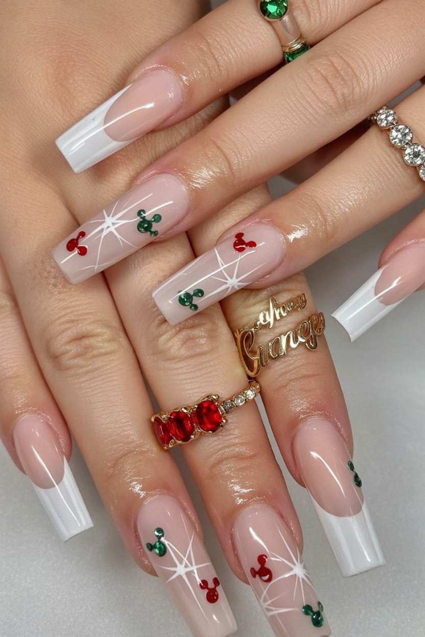 This design is perfect for long square acrylics, where the clean French tips elongate the fingers. The small holly berries add just enough holiday inspo without overpowering the look. It’s ideal for women who want Christmas designs that feel sophisticated and versatile.