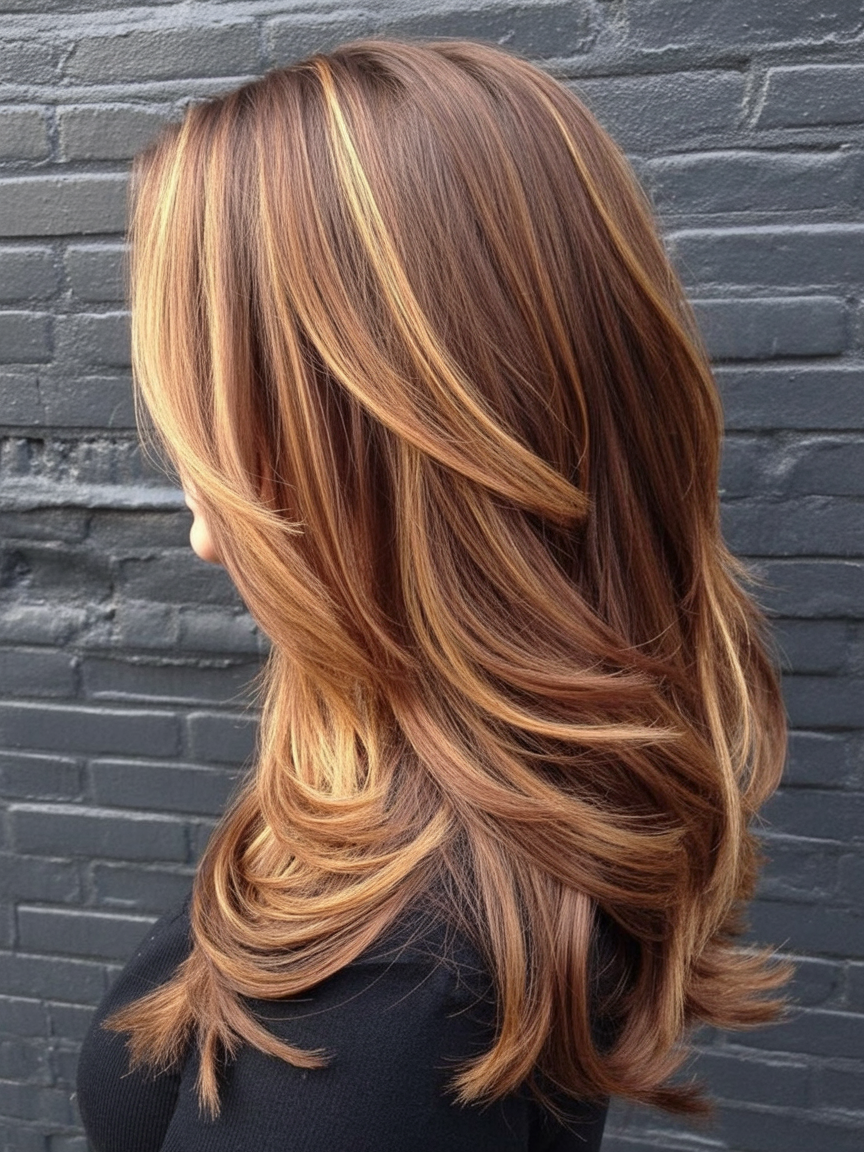 Wavy to thick hair types will love this combo — the layers take out excess bulk while adding shape, and the caramel ribbons define movement. Use a curling wand with alternating directions for that tousled glam, and spritz with texture spray for a lasting finish.