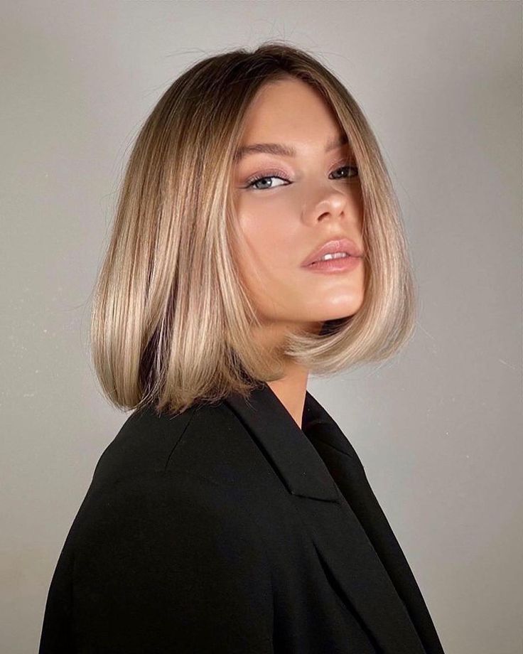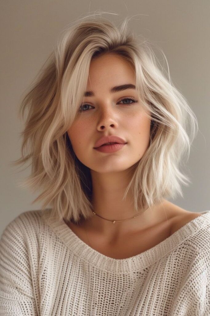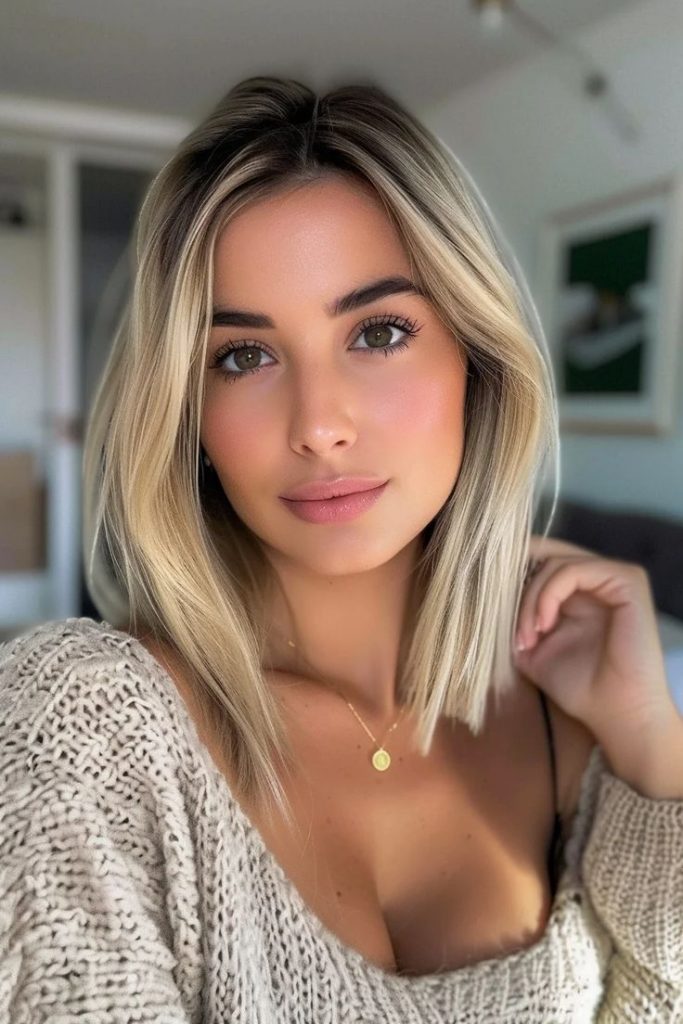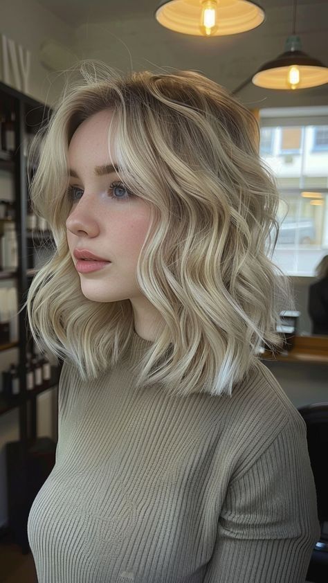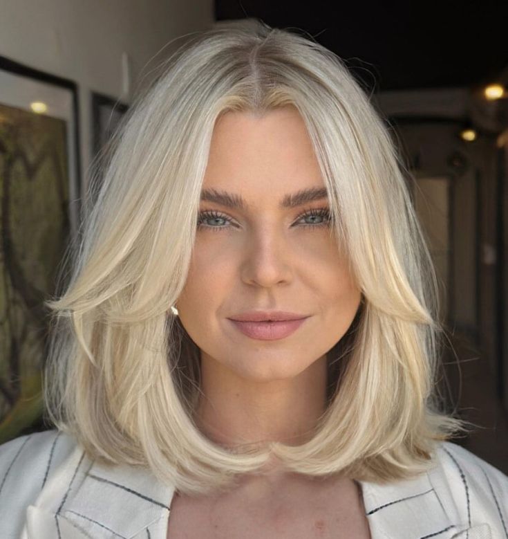 This blonde lob exudes elegance and refinement. Its smooth, blunt edges fall perfectly at shoulder length, making it an ideal choice for those with fine hair who want to create the illusion of thickness. Paired with subtle curtain bangs, this look frames the face beautifully, particularly complementing round faces or angular jawlines.