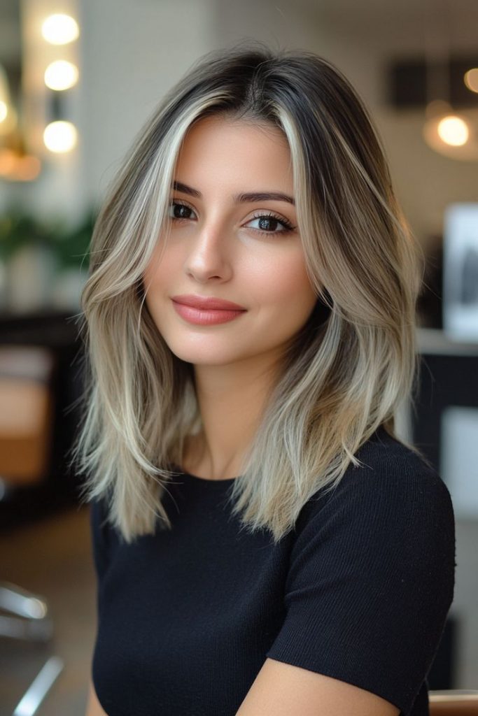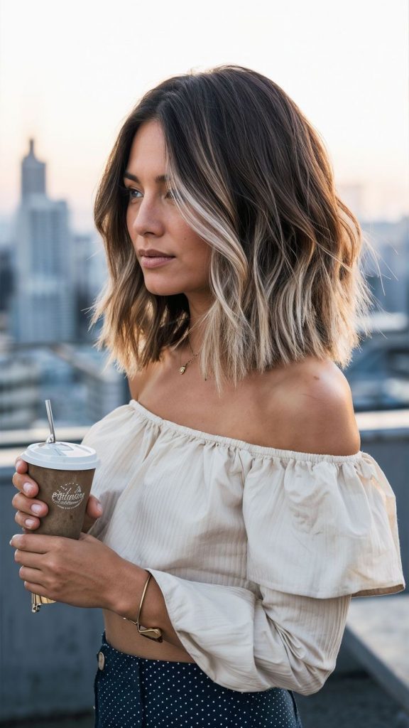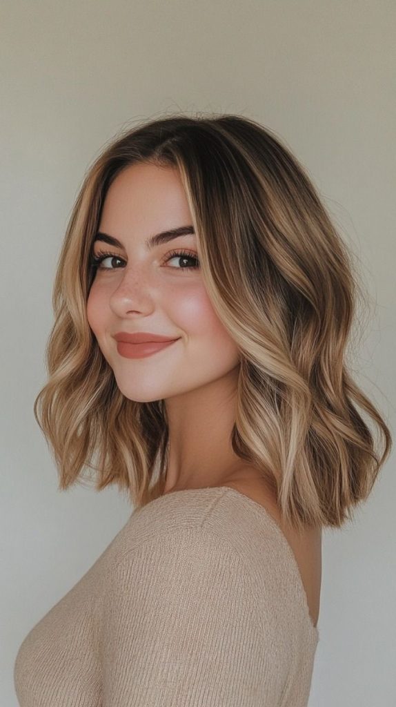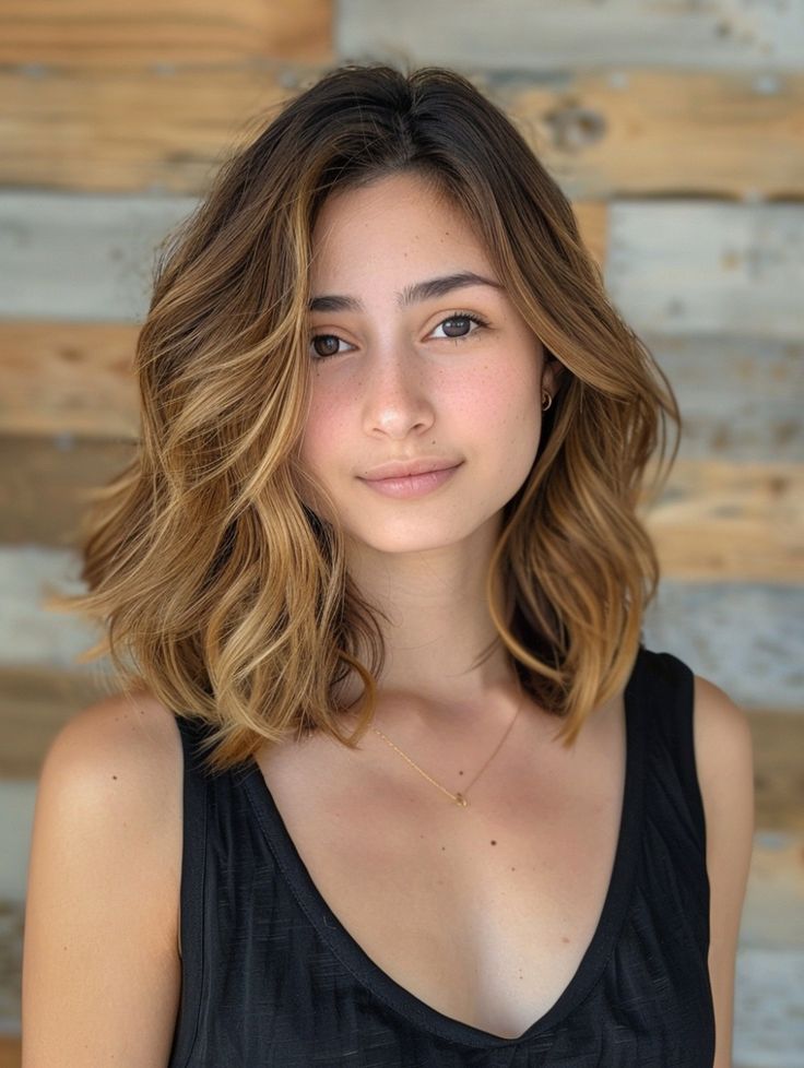 The sun-kissed effect of this lob is achieved through delicate balayage highlights, blending seamlessly into a natural base. The soft waves add texture and dimension, making it perfect for medium-length or thick hair. This style flatters round faces, giving the illusion of elongation.