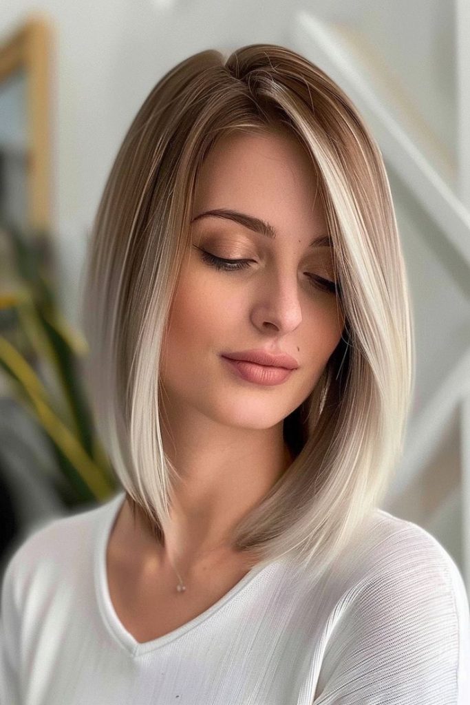 The inverted lob is a fresh, bold take on the traditional bob, with its sharp angles and modern appeal. Paired with an ice blonde finish, this style is perfect for making a bold fashion statement. Its structure works well with straight or wavy hair, elongating the neck and framing the face elegantly.