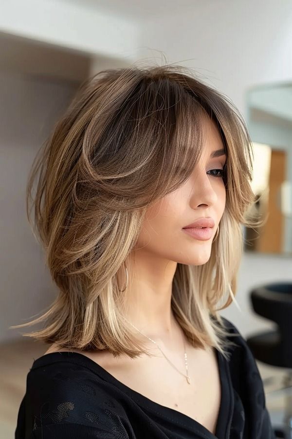 This side-parted blonde lob radiates volume and glamour, thanks to its expertly placed layers. The soft waves cascade down to a shoulder-length finish, making it an ideal choice for women who want a fuller-looking hairstyle.