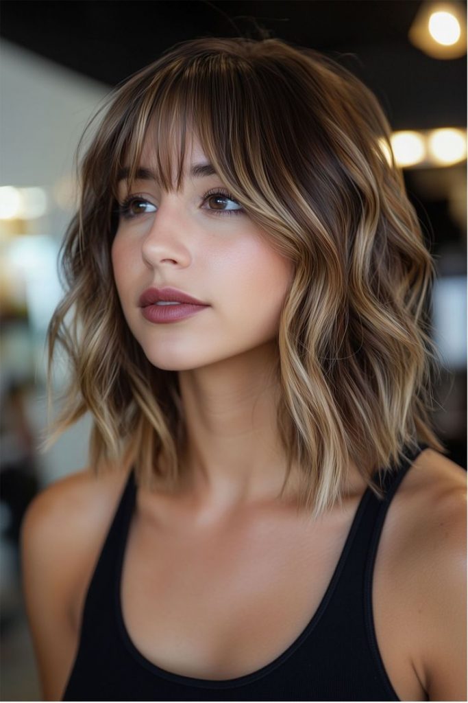 This lob stands out with its playful choppy layers and bold straight bangs. The contrast between the waves and sleek fringe adds an edge to the overall look, making it perfect for women with wavy or curly hair who want to experiment with texture.