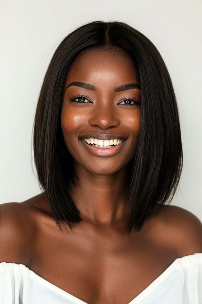 This sleek lob features a middle part that exudes understated sophistication. The smooth, polished strands make it ideal for straight hair, while the slightly angled ends add structure to the style. This look flatters oval and round faces, creating a clean and elegant silhouette.